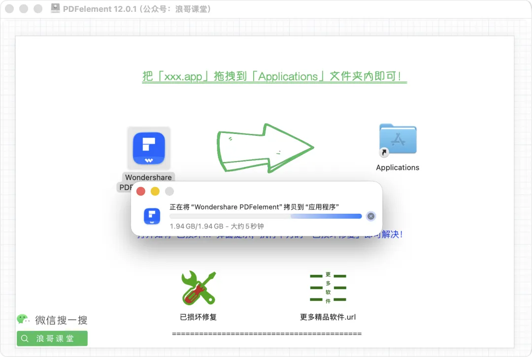 4、打开安装包后,把【Wondershare PDFelement.app】拖拽到【Applications】文件夹内;