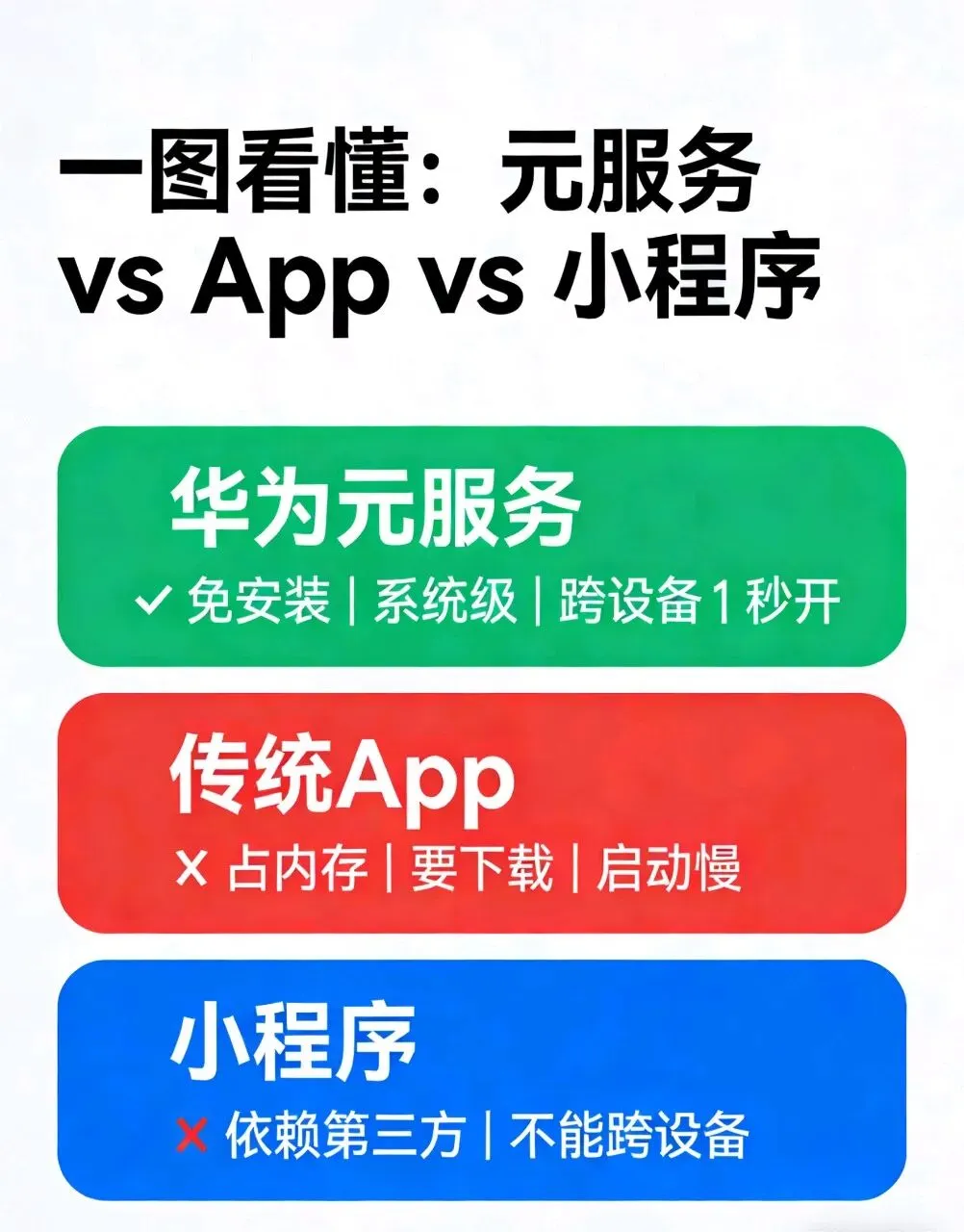 – 跨设备:元服务原生支持|App适配有限|小程序无此功能