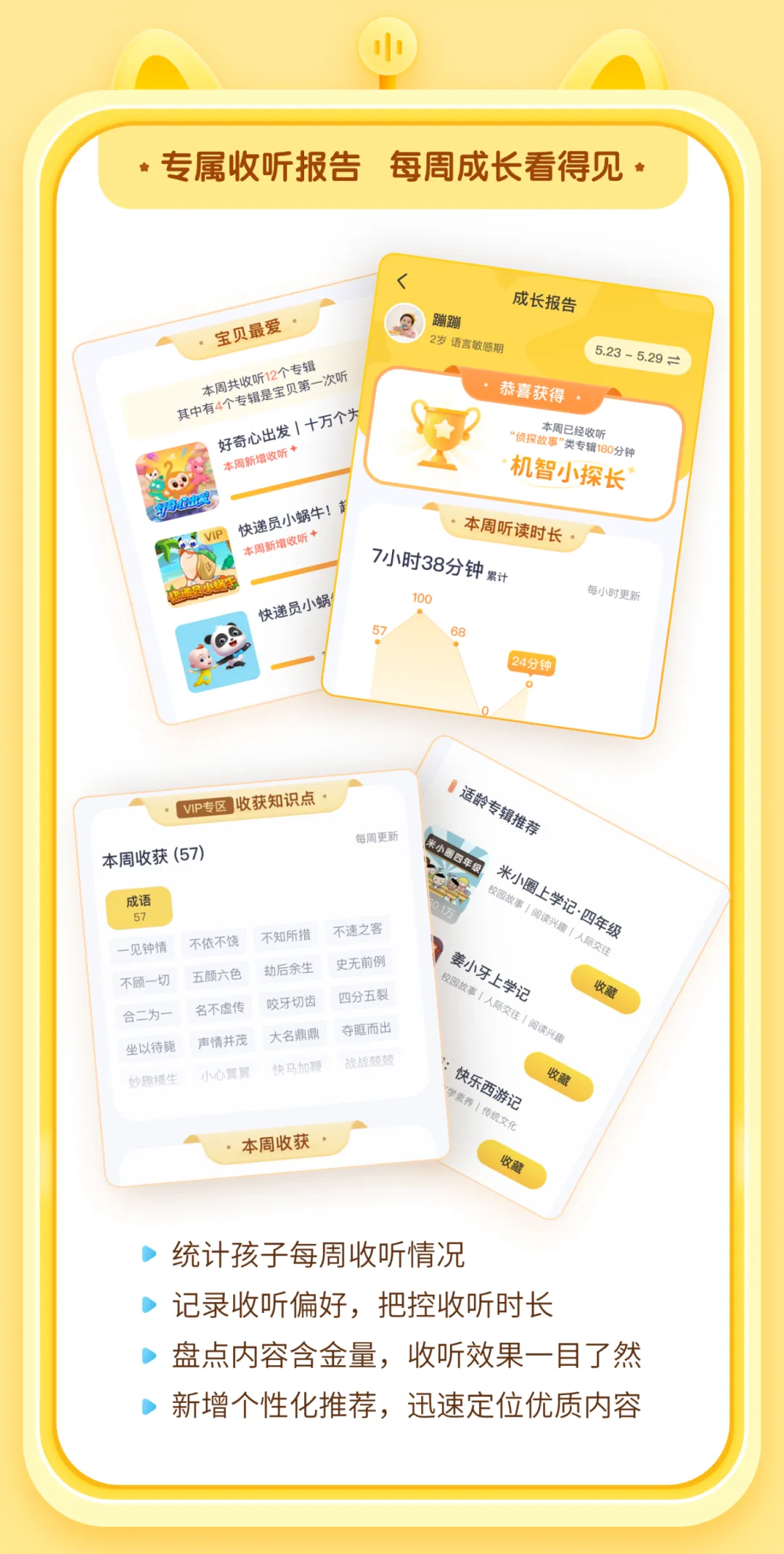 一键拉黑不适内容、自定义收听时长,还能生成专属收听报告,孩子的听读情况一目了然。