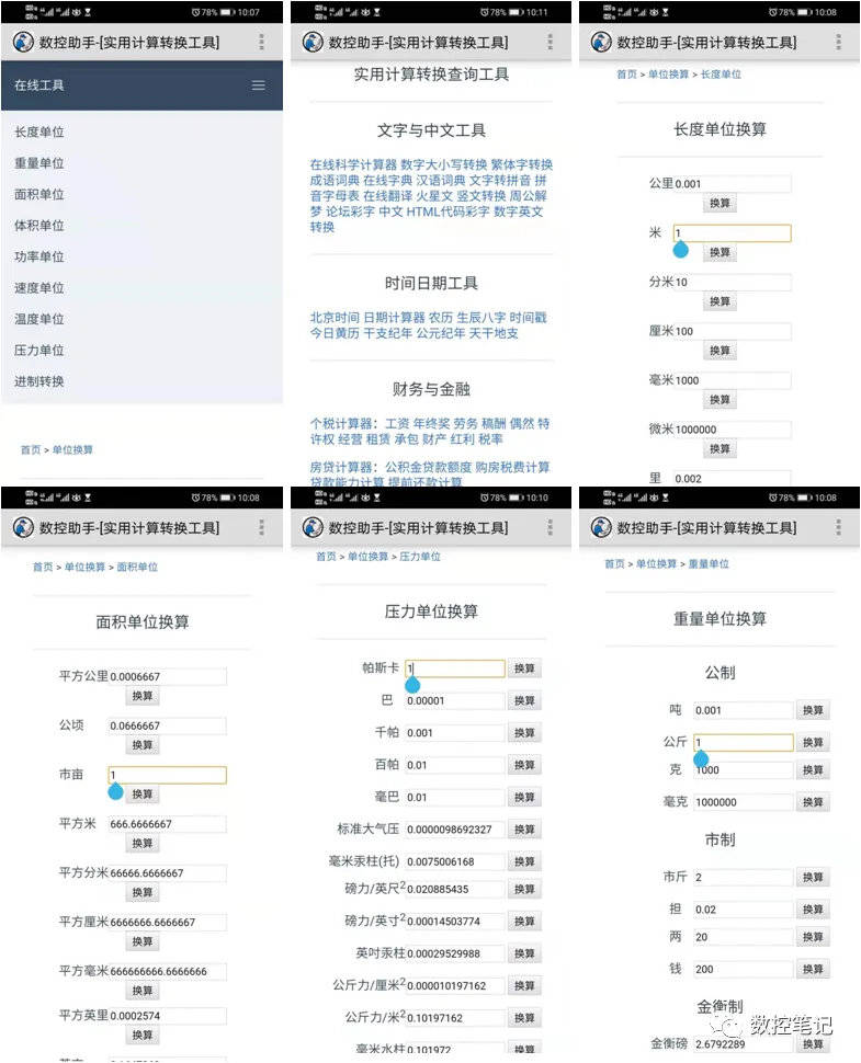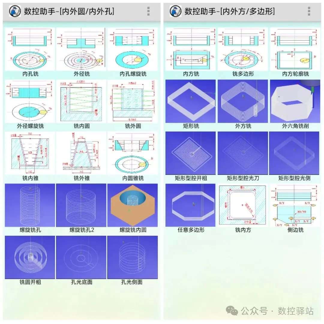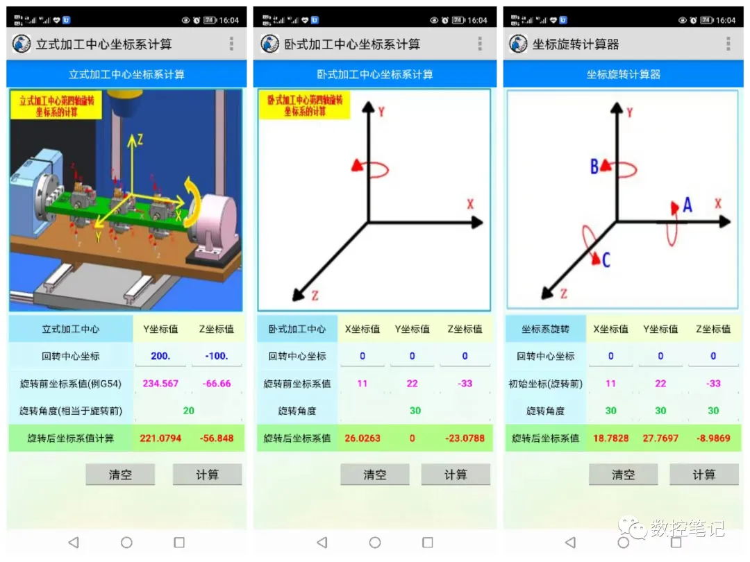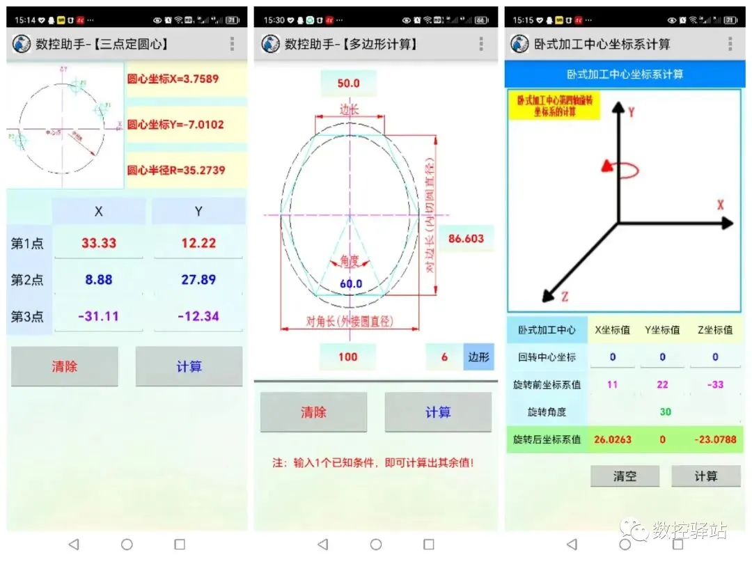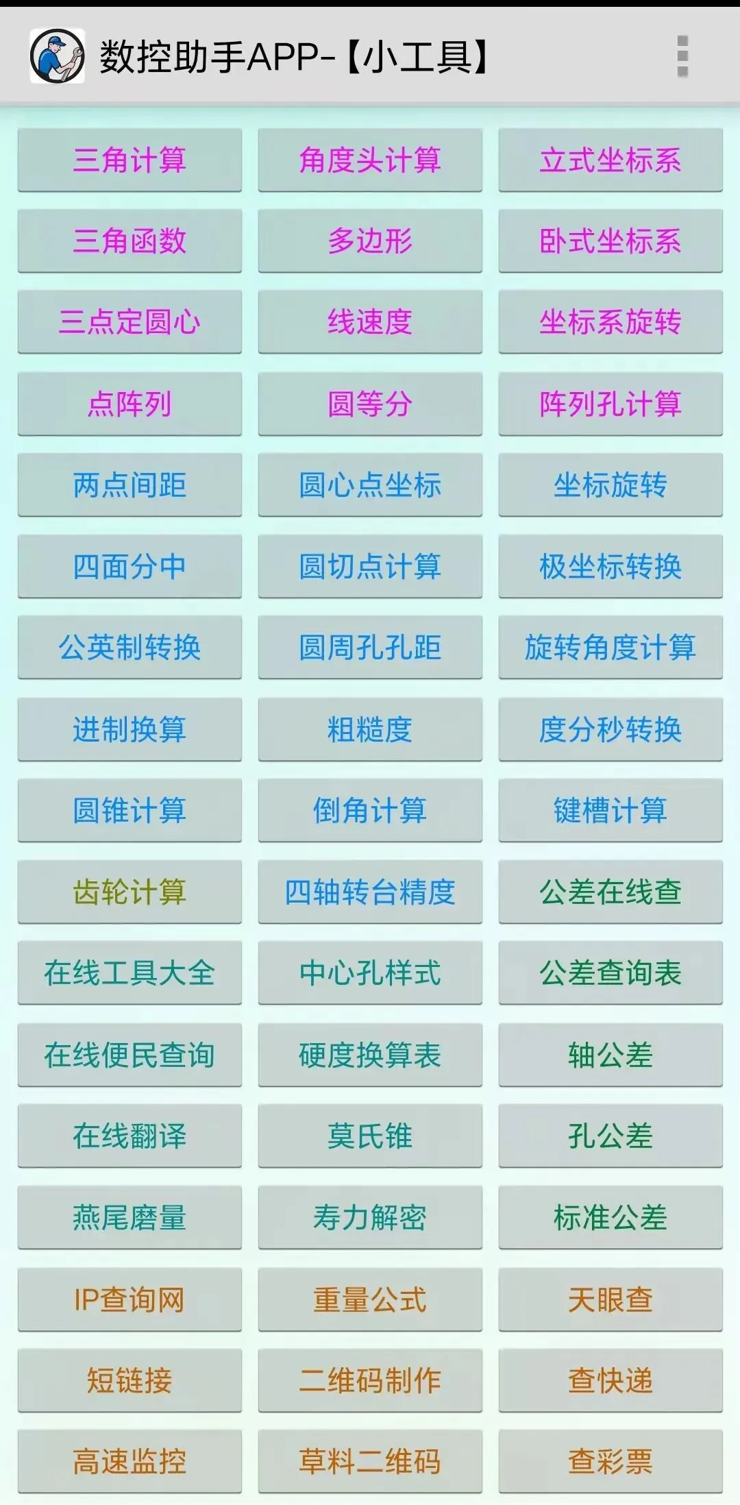两点间距、三点定圆心、四面分中圆周孔孔距、极坐标转换、坐标旋转,坐标旋转计算器,多边形、圆心点坐标、进制换算、线速度、粗糙度、度分秒转换、圆锥计算、倒角计算、重量公式、公英制转换燕尾磨量、攻丝扭矩、特种作业证查询、美国寿力解密、等功能。