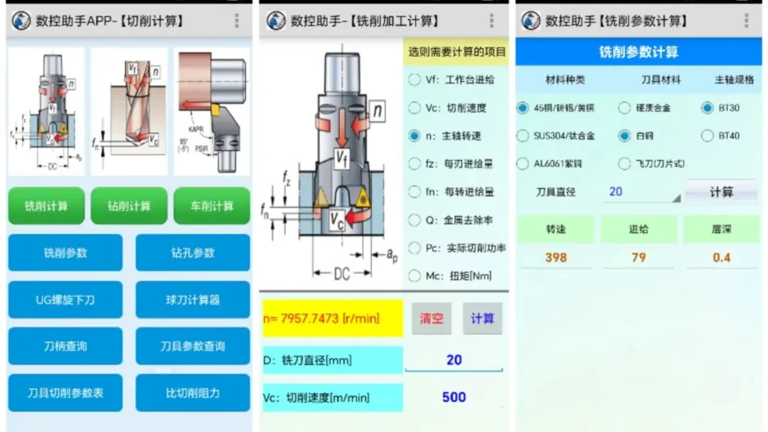 铣削计算、钻削计算、车削计算UG螺旋下刀、球刀计算器、刀柄查询、刀具切削参数表、比切削阻力等功能。