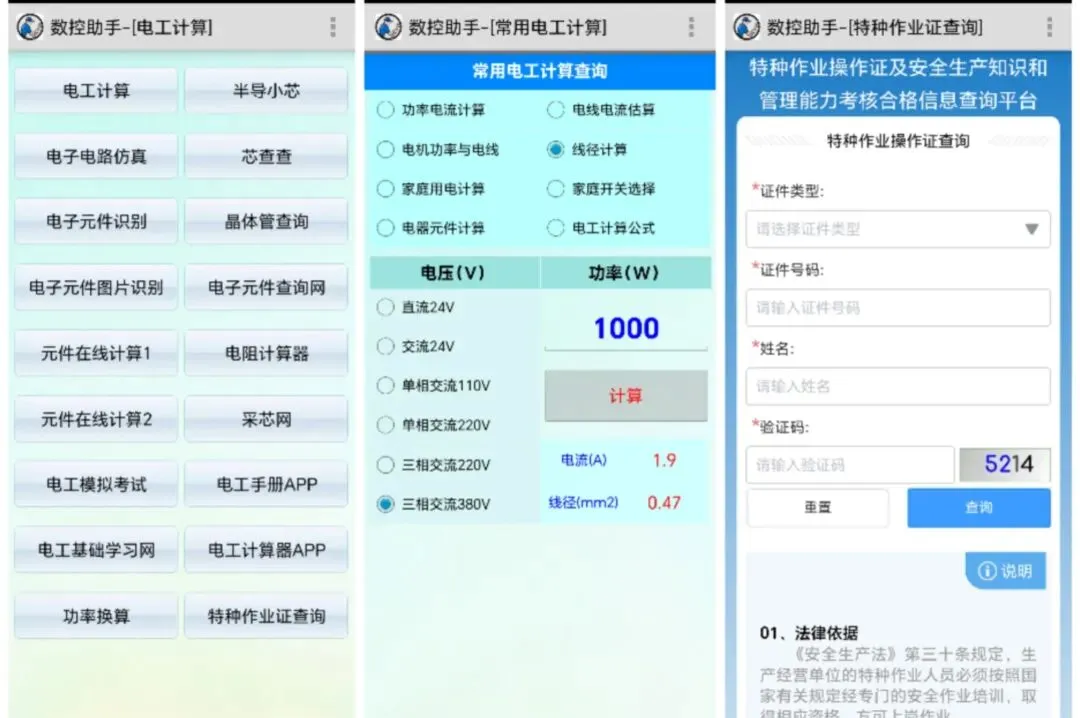 功率电流计算、电线电流估算、电机功率载流、线径电流计算、功率单位换算、伺服变频手册查询、电子电路计算、电子类相关实用计算查询工具大全、电工学习、电工论坛、特种作业证查询、电工模拟考试、电工计算器APP下载 等功能