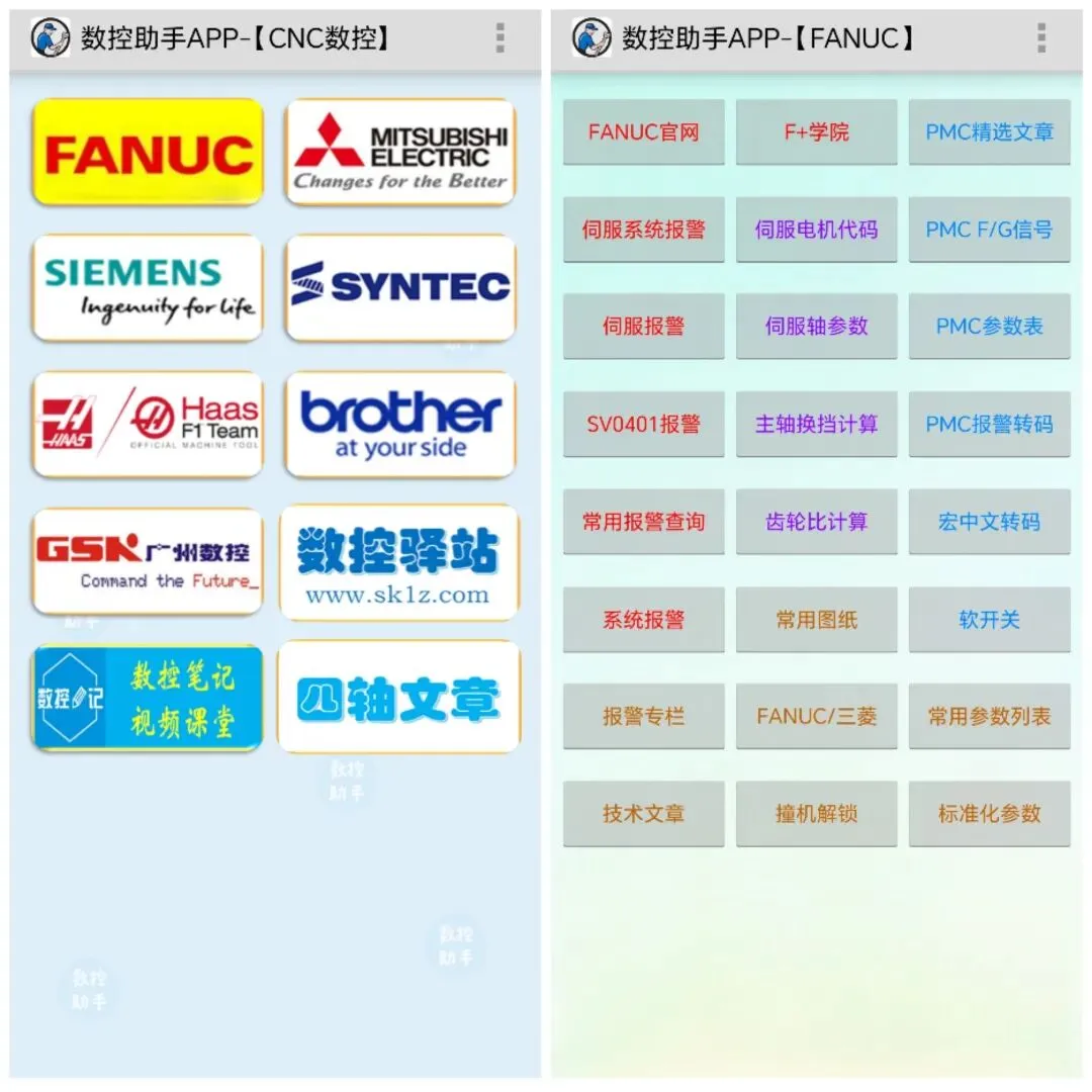 具有查询FANUC齿轮比计算、PMC及宏程序中文报警转码、伺服电机代码、PMC参数及信号地址、主轴换挡计算等;查询兄弟机PLC信号地址、四轴参数、加工模式等;查询三菱PLC开关、PLC常数、R地址信号、加工时间参数;查询 哈斯、新代、西门子、广数 数控系统常见故障报警等;