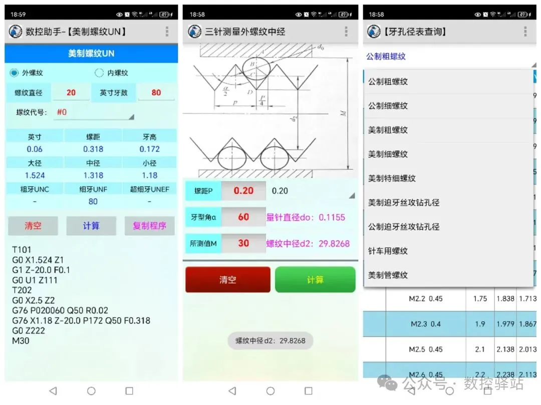 三角螺纹、牙孔径查询、攻丝螺纹扭矩、螺纹底孔径、螺纹钻径、攻丝前钻径、公制/美制/英制螺纹查询等功能。