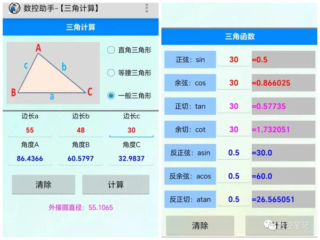 可计算直角三角形、等腰三角形一般三角形及三角函数计算功能。