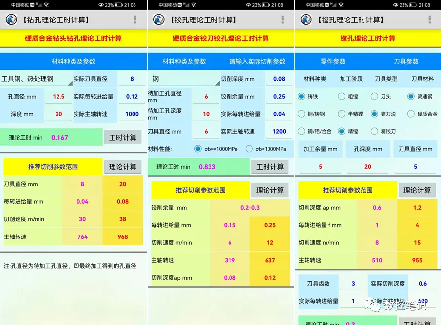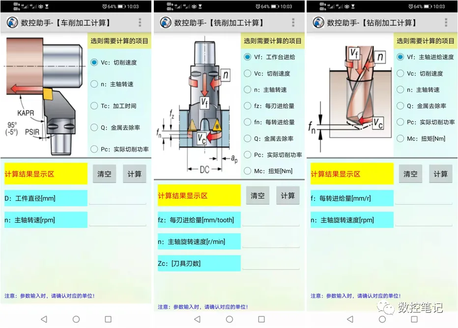 铣削计算、钻削计算、车削计算UG螺旋下刀、球刀计算器、刀柄查询、刀具切削参数表、比切削阻力等功能。