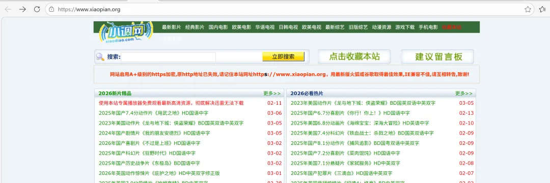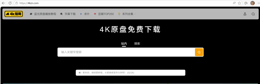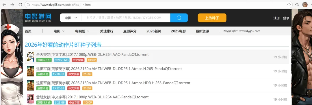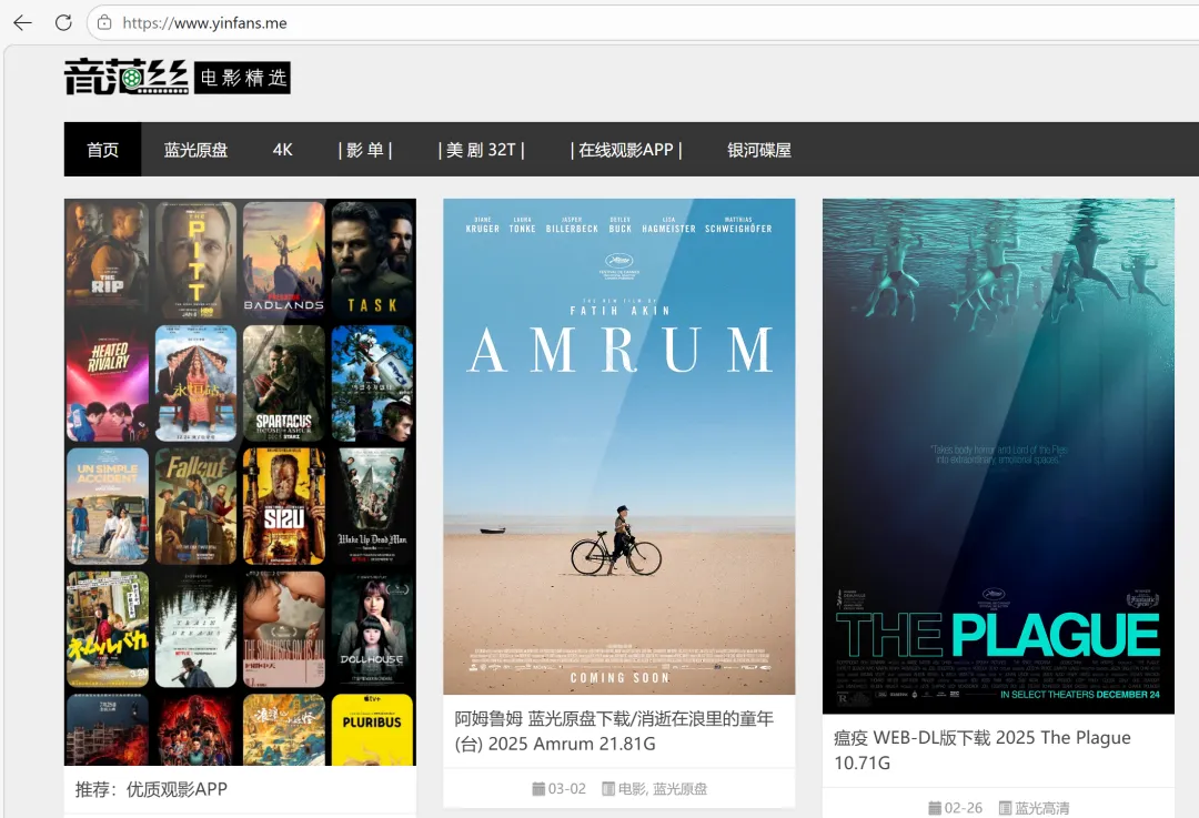特点:是主打4K / 蓝光原盘、高评分精选、无广告、免费下载的电影资源站,核心定位:少而精、质量优先。影片的大小都很大。提供磁力下载链接,需要借助迅雷,夸克网盘等下载工具进行下载。