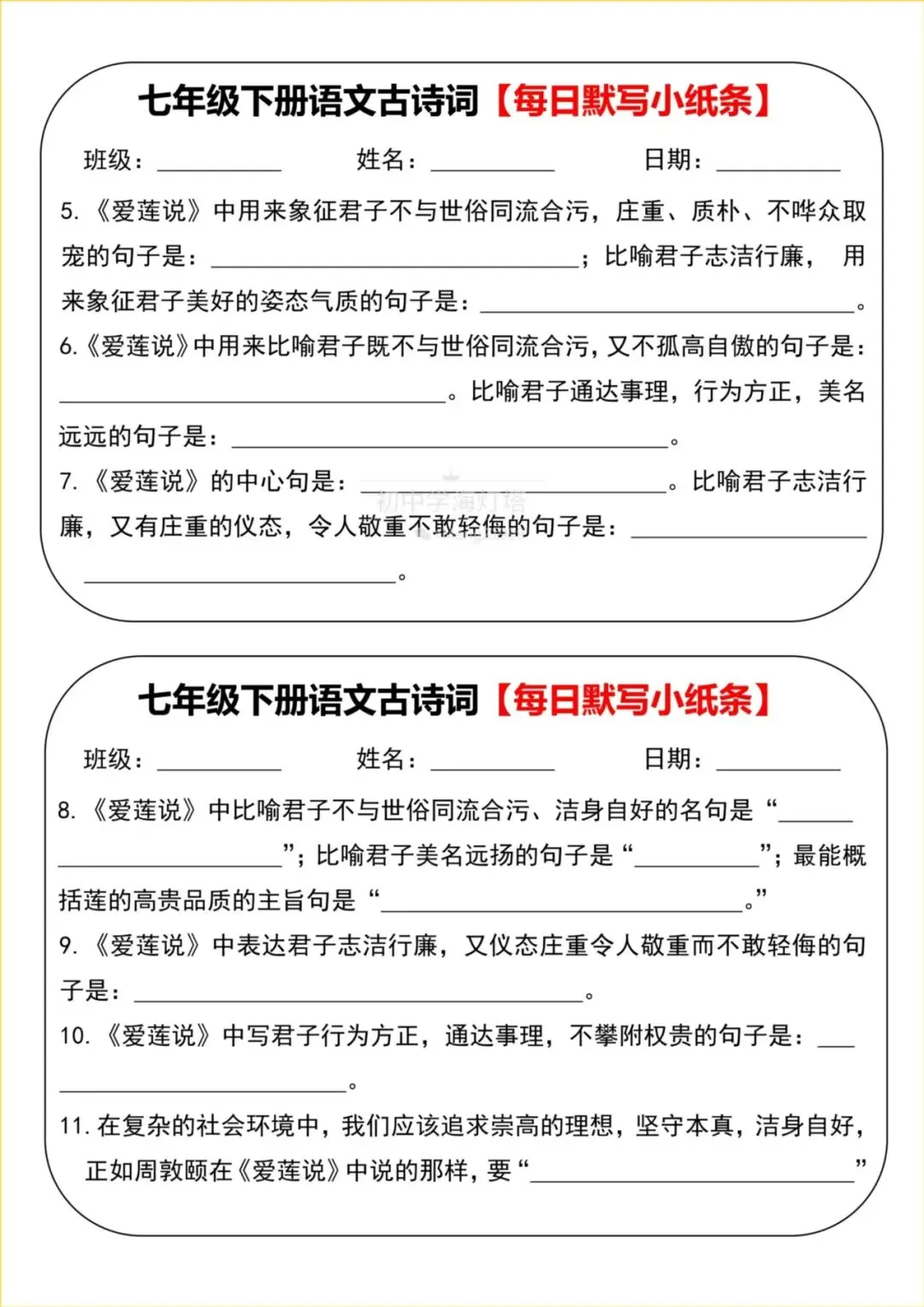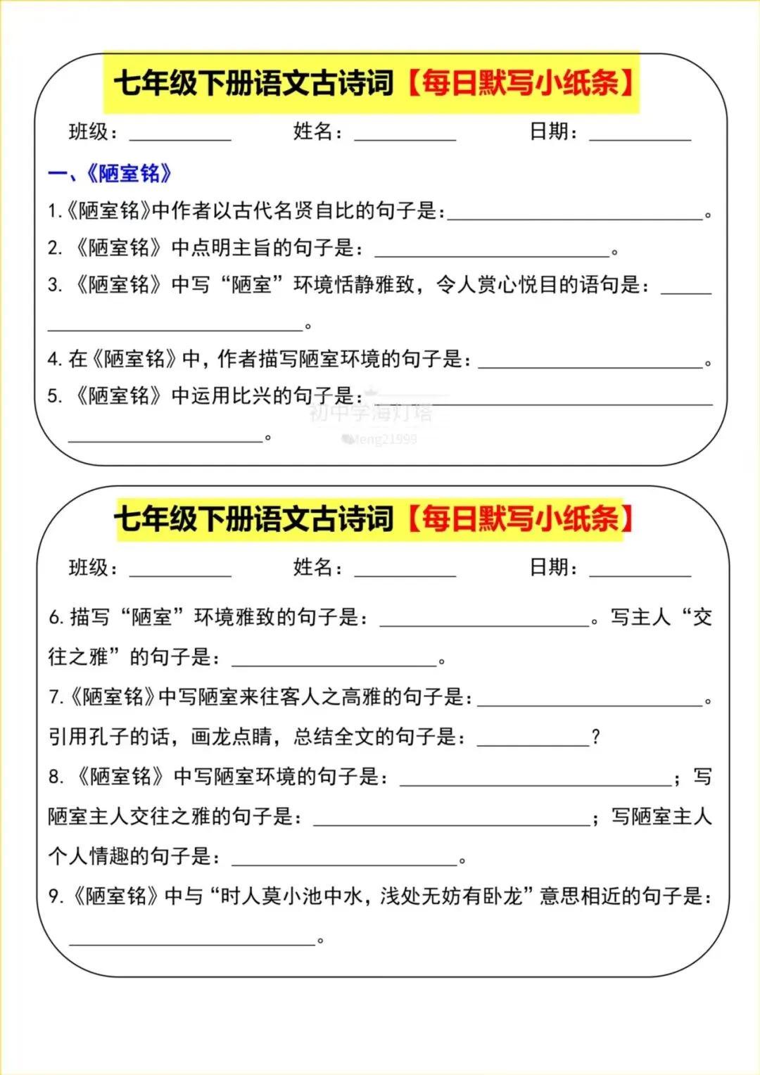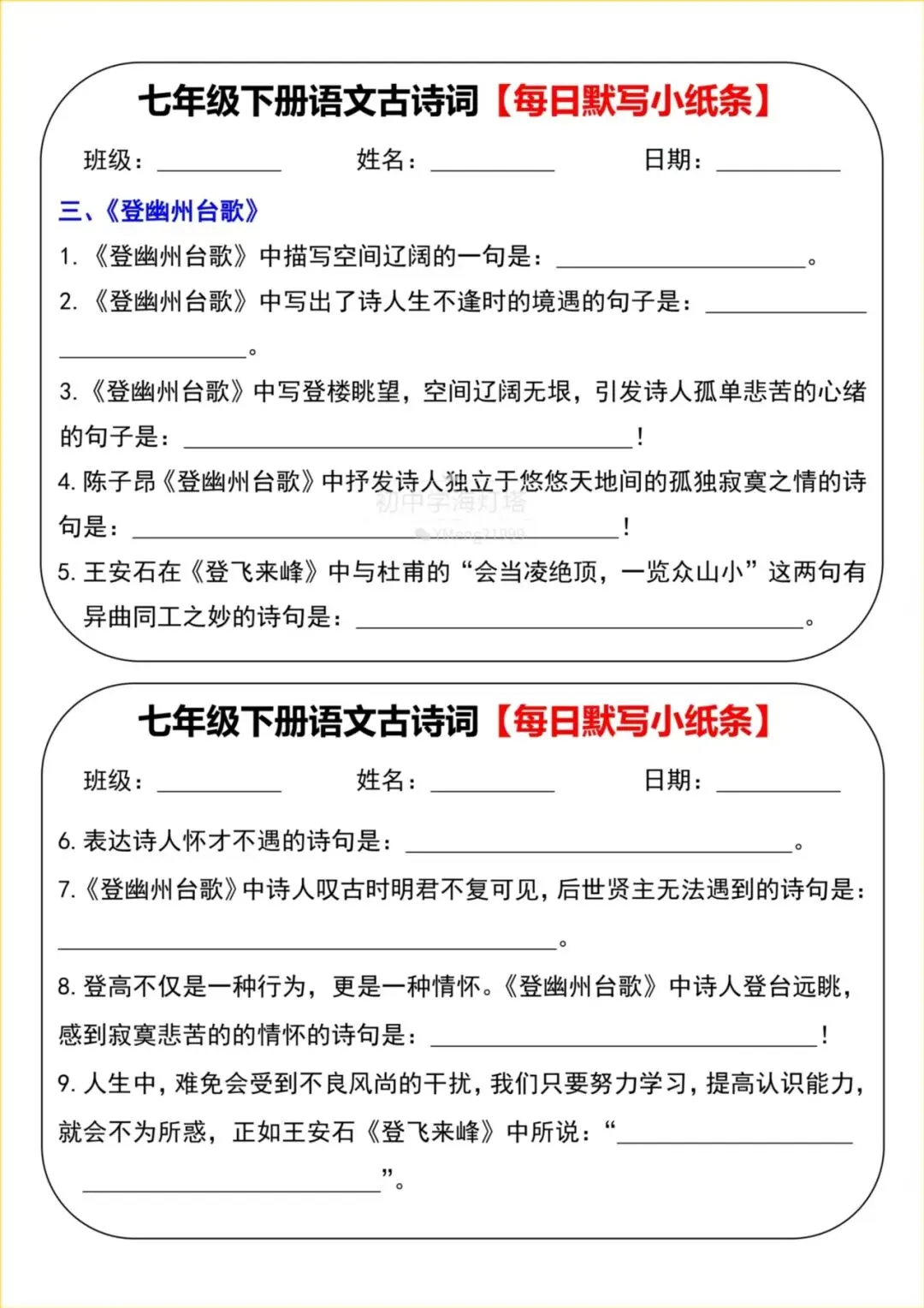 2026春【人教部编版】七年级下册〈语文〉全册《古诗词》每日默写小纸条,有答案,可下载打印!