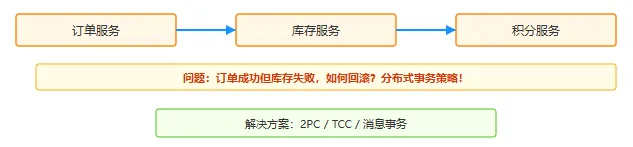 场景:订单服务 + 库存服务 + 积分服务。