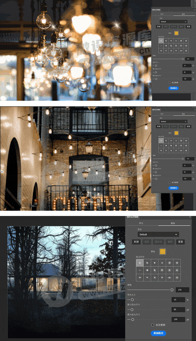 支持18种不同的眩光,可以一键生成酷炫逼真的炫光阵列,常用于照片和特定的夜市效果图后期处理。炫光数量、大小和颜色等均可调节