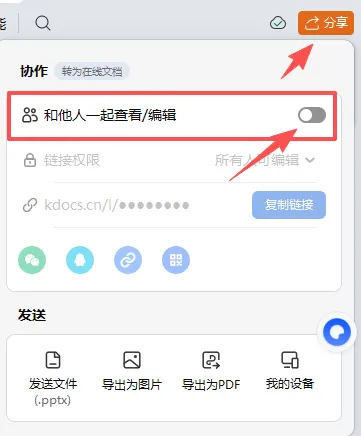 点击右上角的“分享”按钮,打开“和他人一起查看/编辑”右侧的按钮。文档就会进入协作状态。