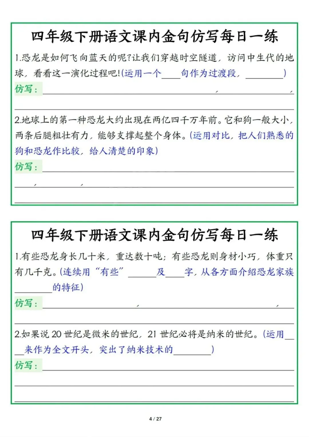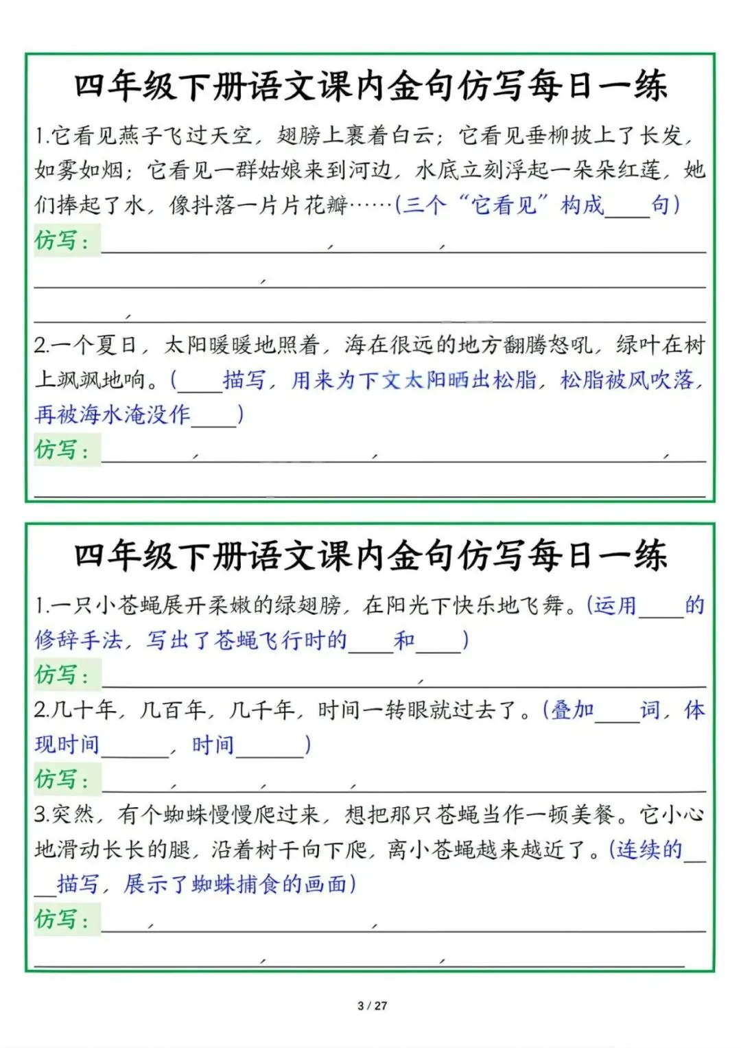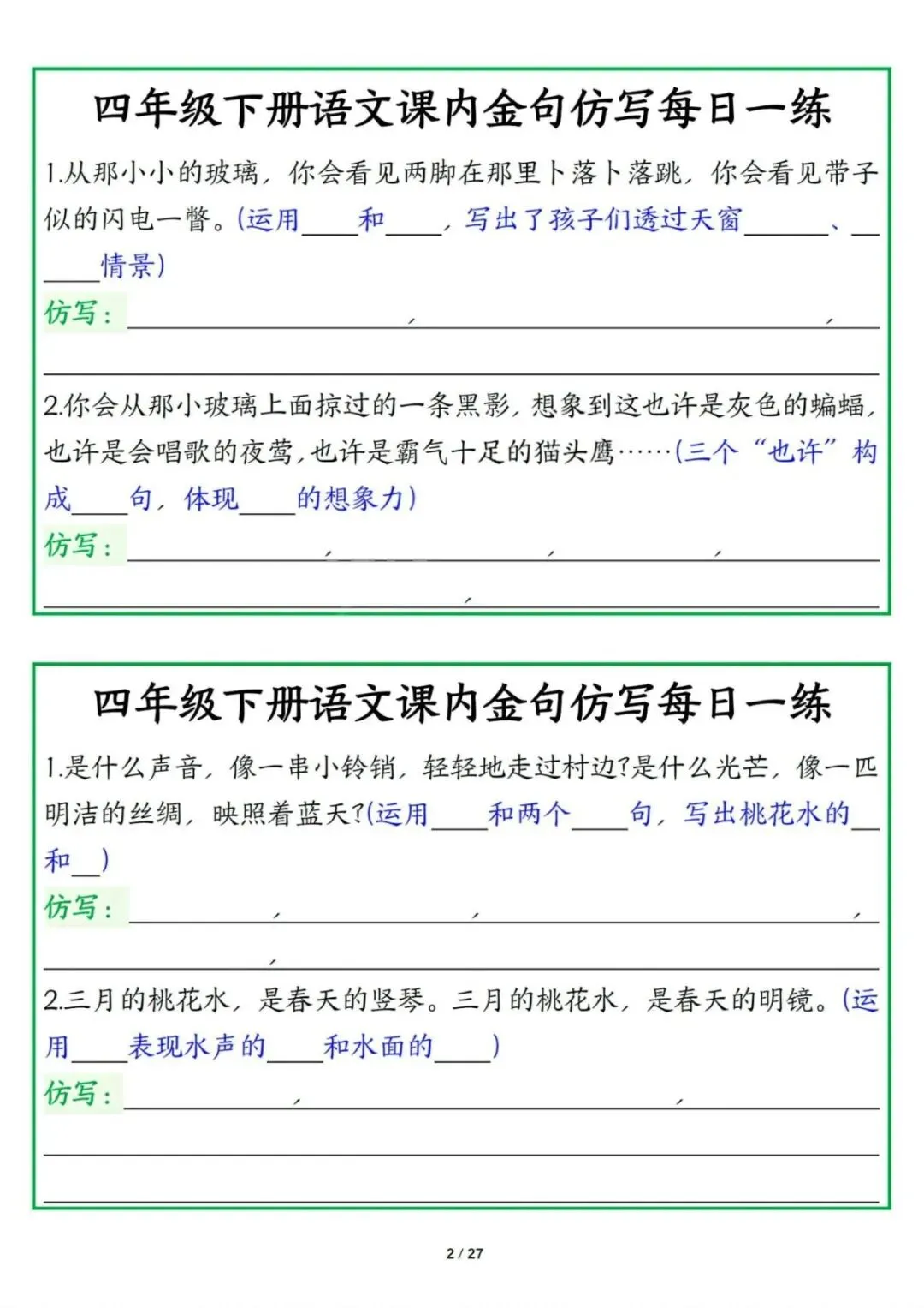 新版四年级下册语文课内金句仿写每日一练,电子版可打印
