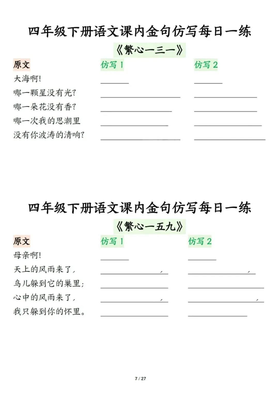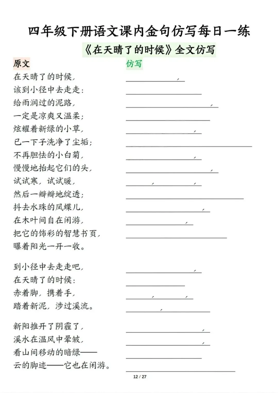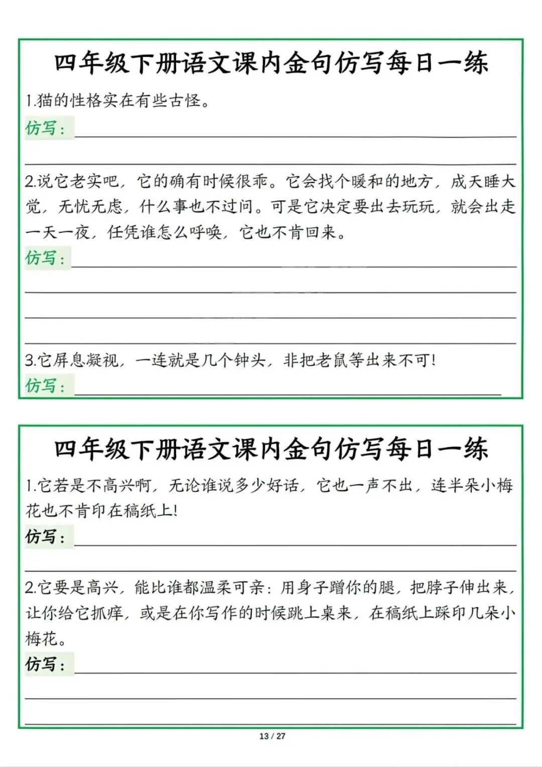 新版四年级下册语文课内金句仿写每日一练,电子版可打印