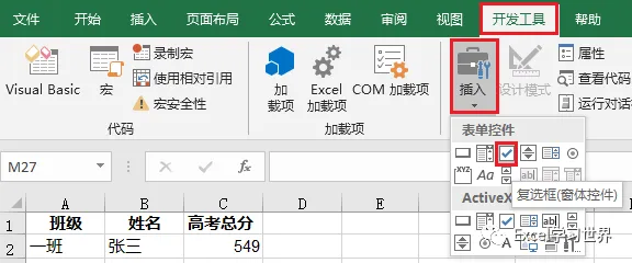 1. 选择菜单栏的“开发工具”–>“插入”–>“复选框”