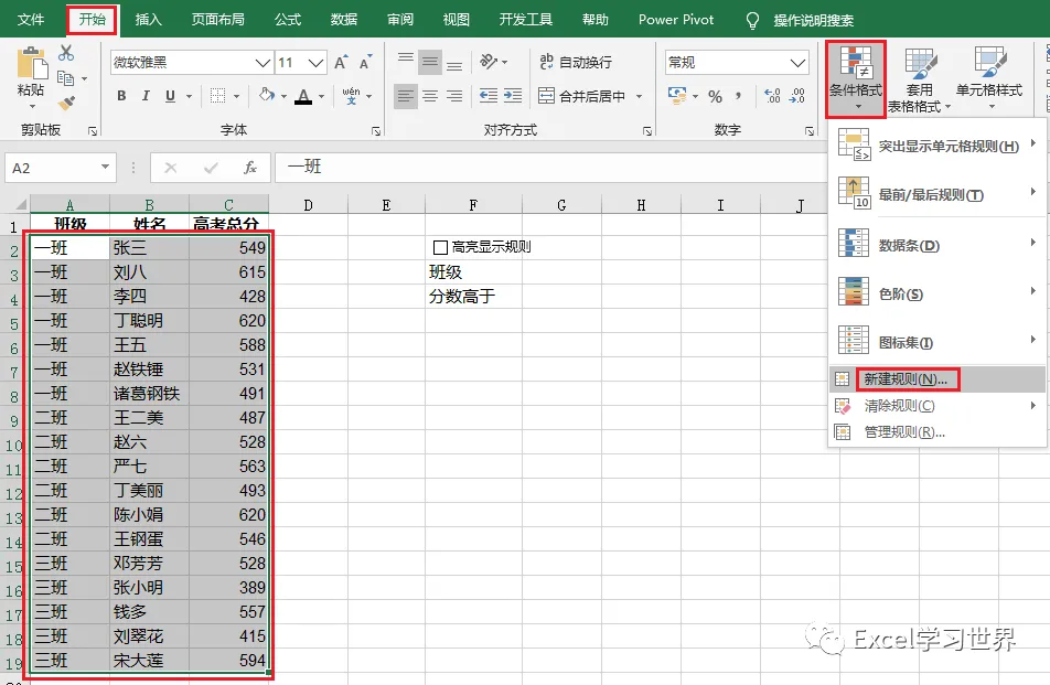 8. 现在开始设置高亮显示的条件格式:选中需要高亮显示的区域 A2 至 C19 –> 选择菜单栏的“开始”–>“条件格式”–>“新建规则”