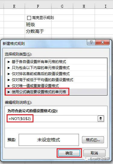 9. 在弹出的对话框中选择“使用公式确定要设置格式的单元格”–> 在公式区域输入“=NOT($G$2)”–> 点击“确定”
