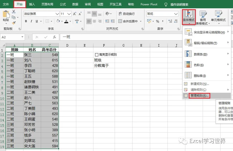 10. 选择菜单栏的“开始”–>“条件格式”–>“管理规则”