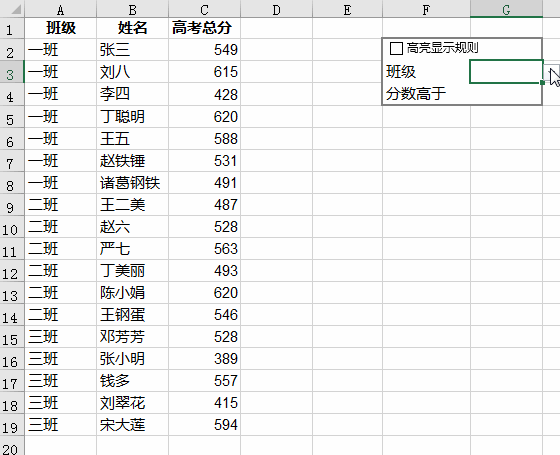 6. 在 F3 和 F4 分别添加新的条件“班级”和“分数高于”–> 开始制作“班级”下拉菜单:选中 G3 单元格 –> 选择菜单栏的“数据”–>“数据验证”