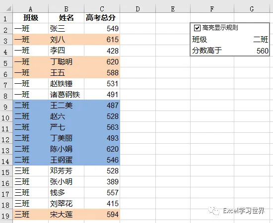 “班级”的优先级比“分数高于”高,因此当两个条件同时满足时,执行“班级”的条件