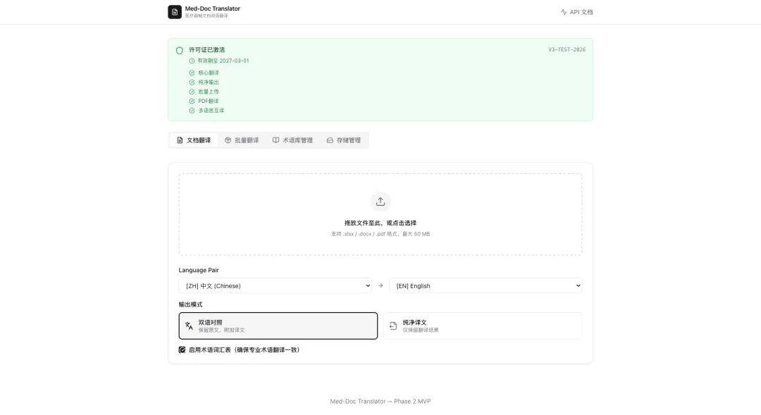 ·支持格式:Word(.docx)、Excel(.xlsx)、PDF(实验性),输出双语对照格式