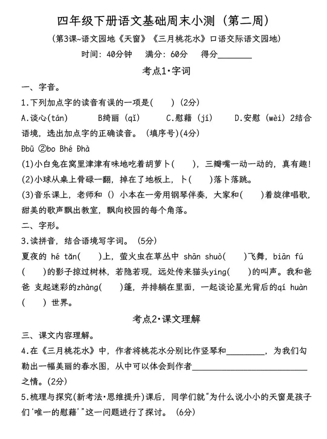 26春新版部编版四年级下册语文基础周末小测;含字音,字形,字词理解等;可打印