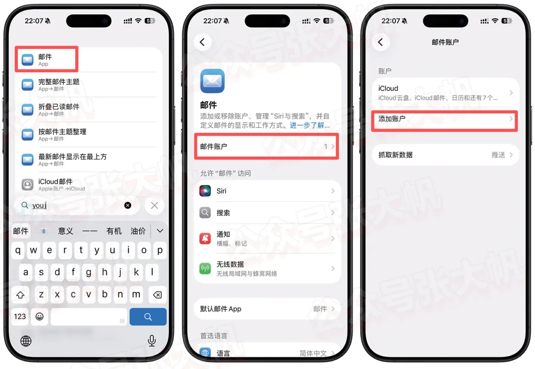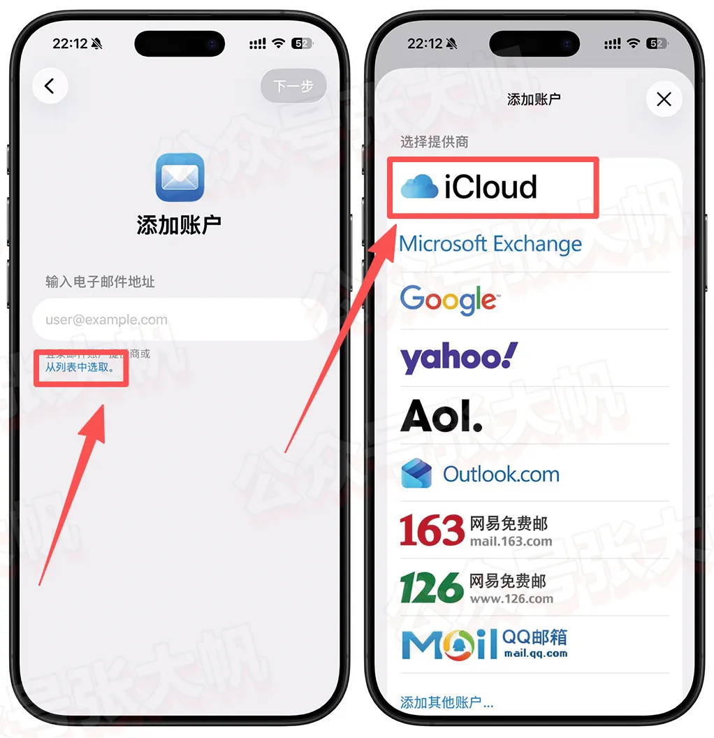 我们打开设置>邮件(没有的去 App Store下载)>邮件账户>添加账户>从列表中选取>iCloud(注意是添加iCloud账号不是其他邮箱账号,添加你的其他的 Apple ID,之后在 App Store 切换就不需要双重验证了,添加后更新软件也不需要输入密码了