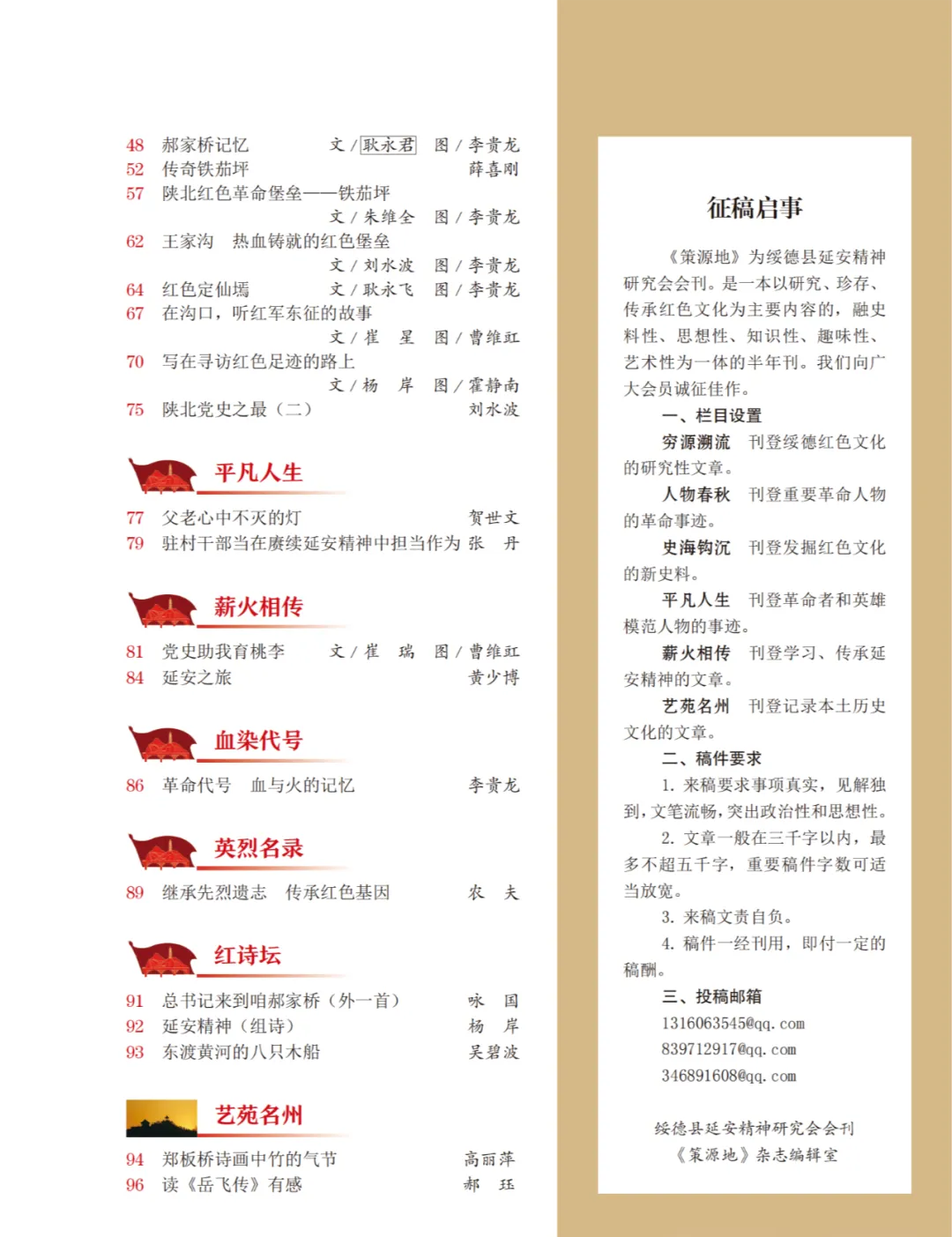 【杂志简介】《策源地》为陕西省榆林市绥德县延安精神研究会会刊,为半年刊,主要发表红色文化为主要内容的稿件,上刊作者有稿费。