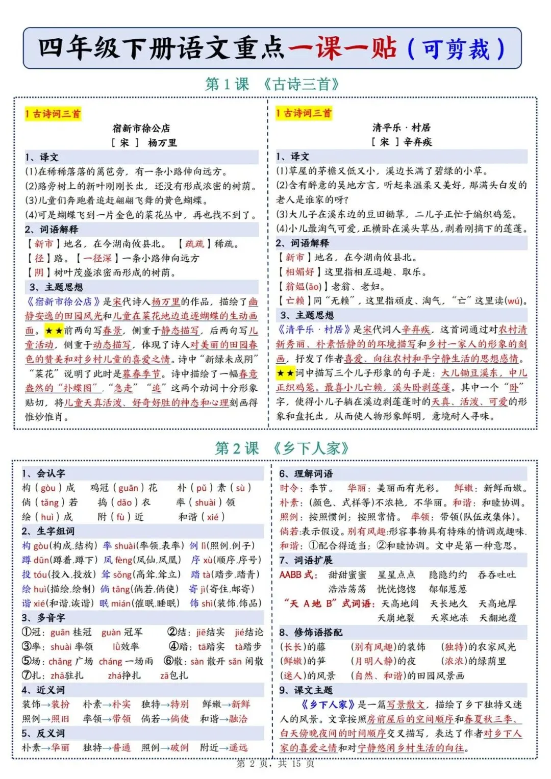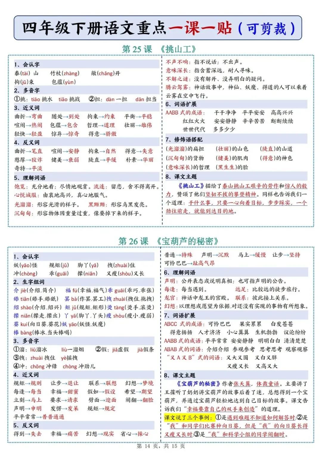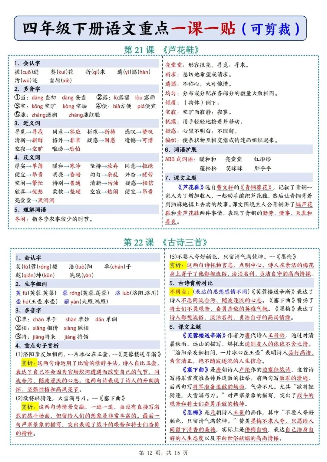 四年级下册语文重点《一课一贴》可下载打印