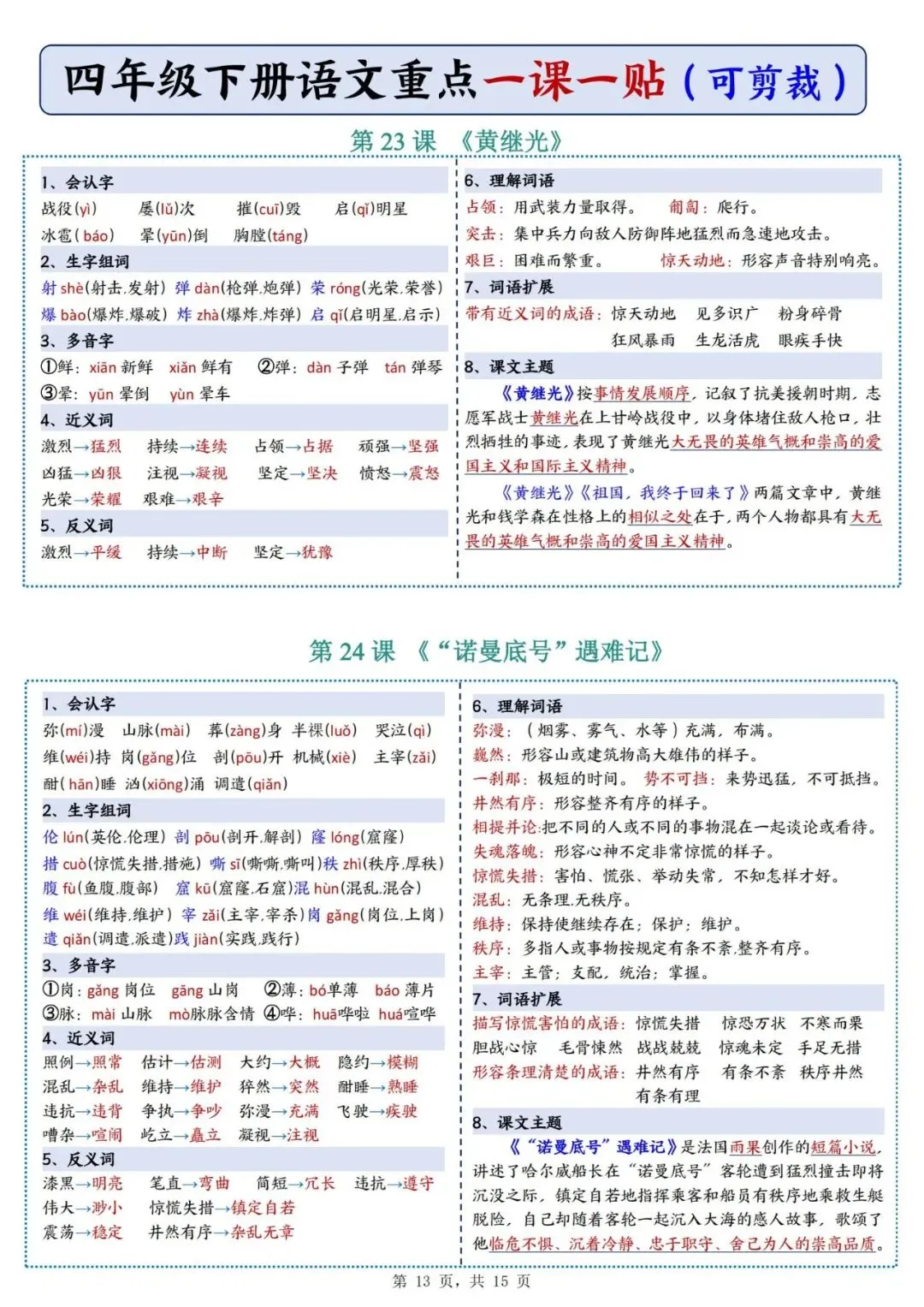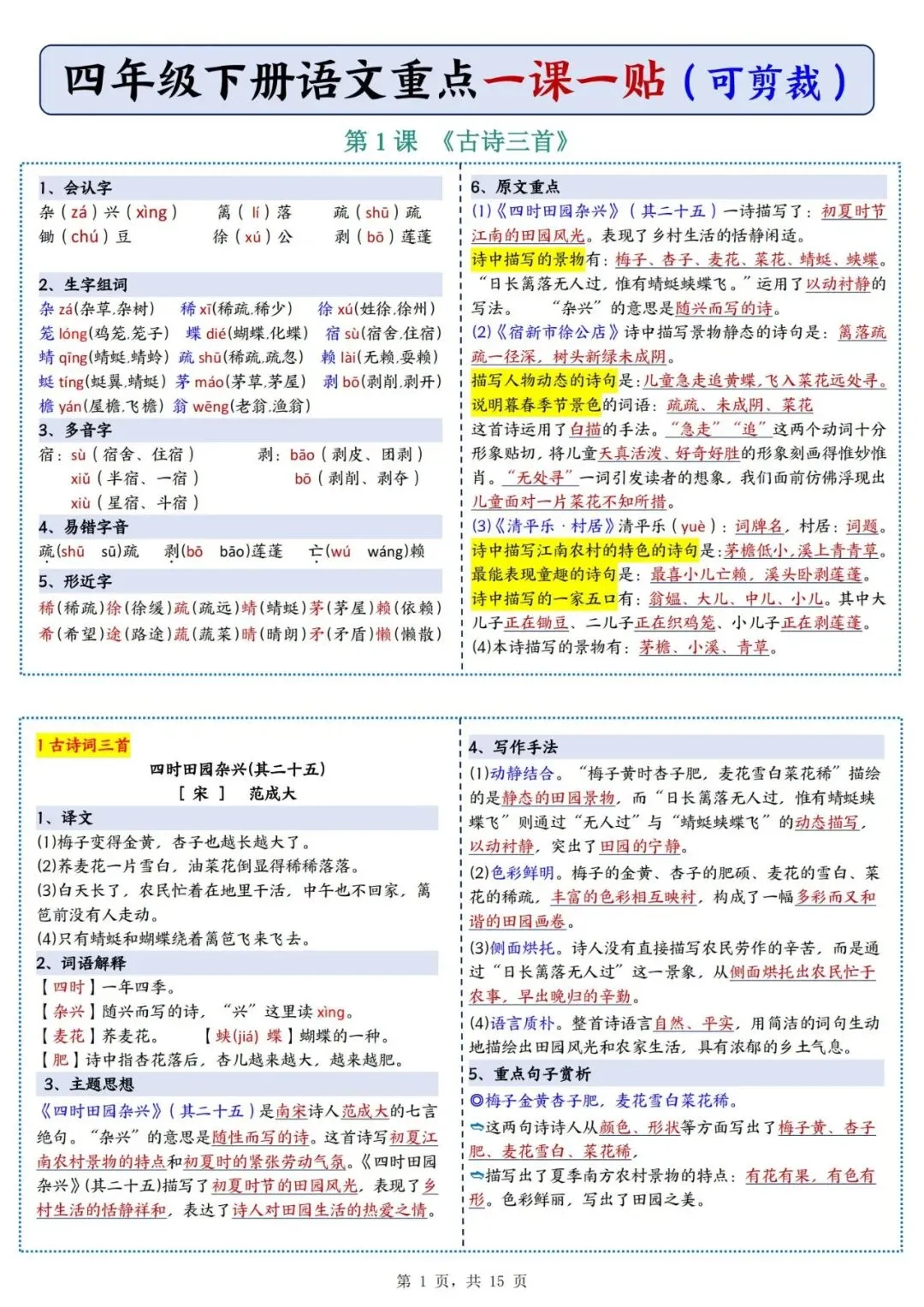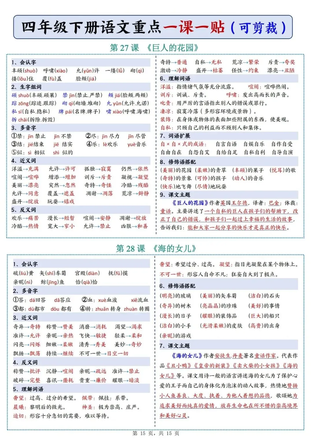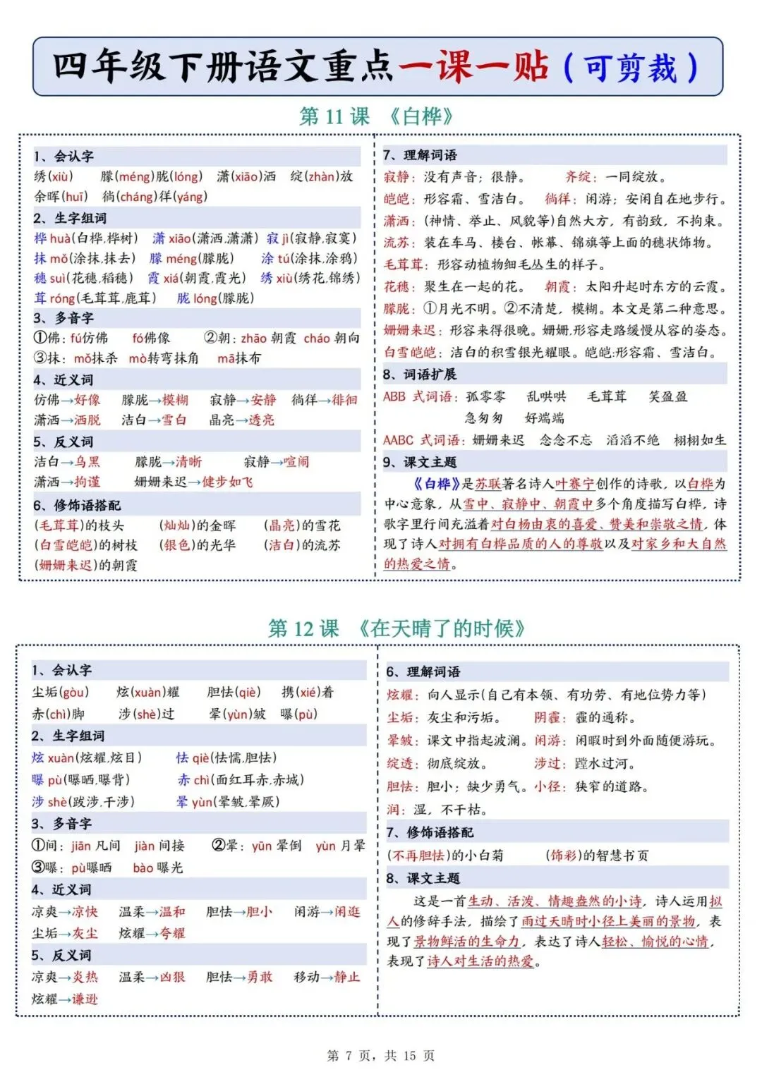 四年级下册语文重点《一课一贴》可下载打印