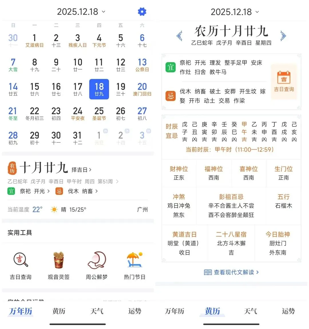 最实用的是它的农历功能,包含宜忌、时辰、财神位、黄道吉日等内容,对有这方面需求的朋友来说特别方便。