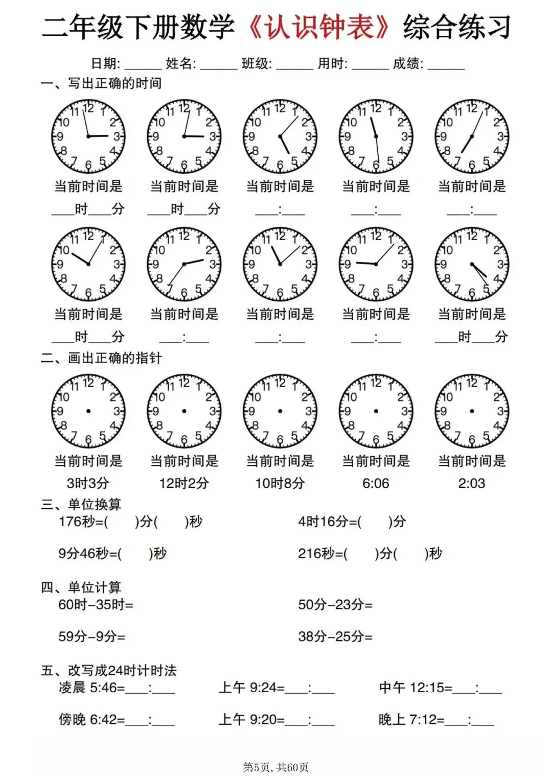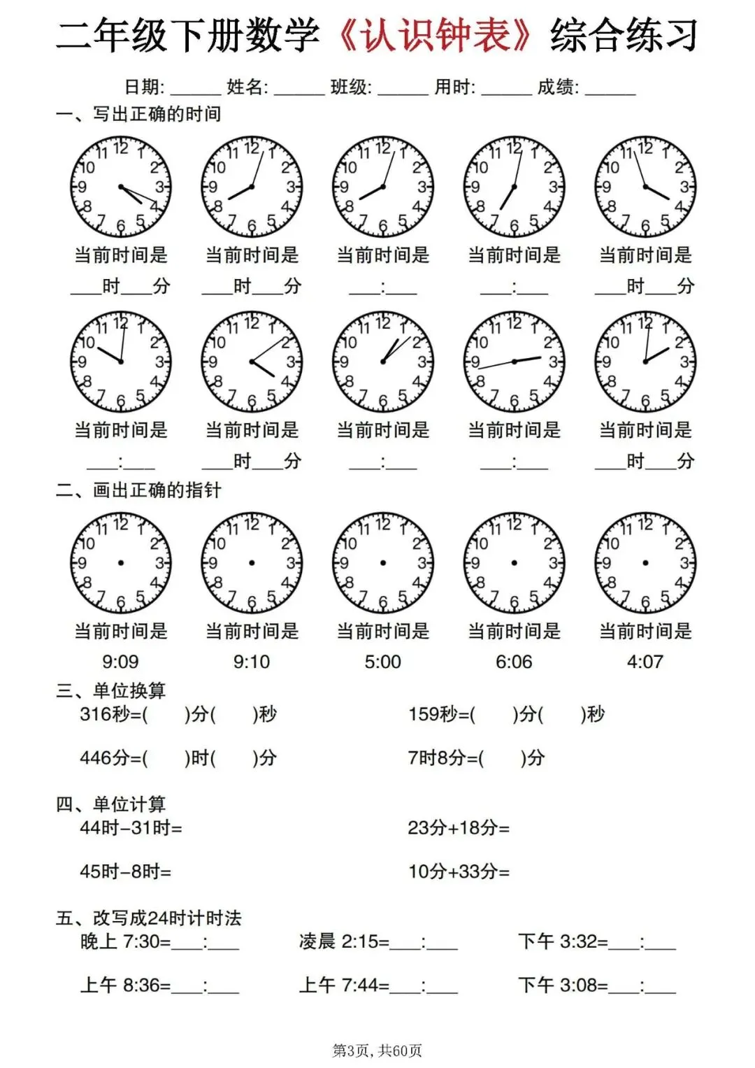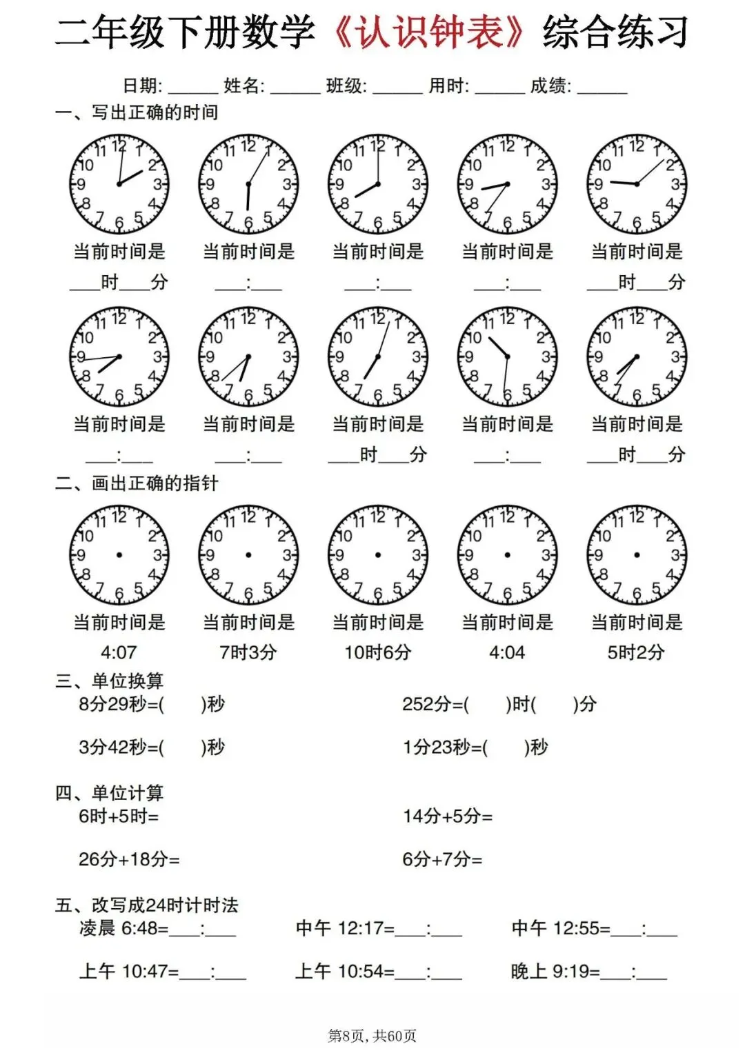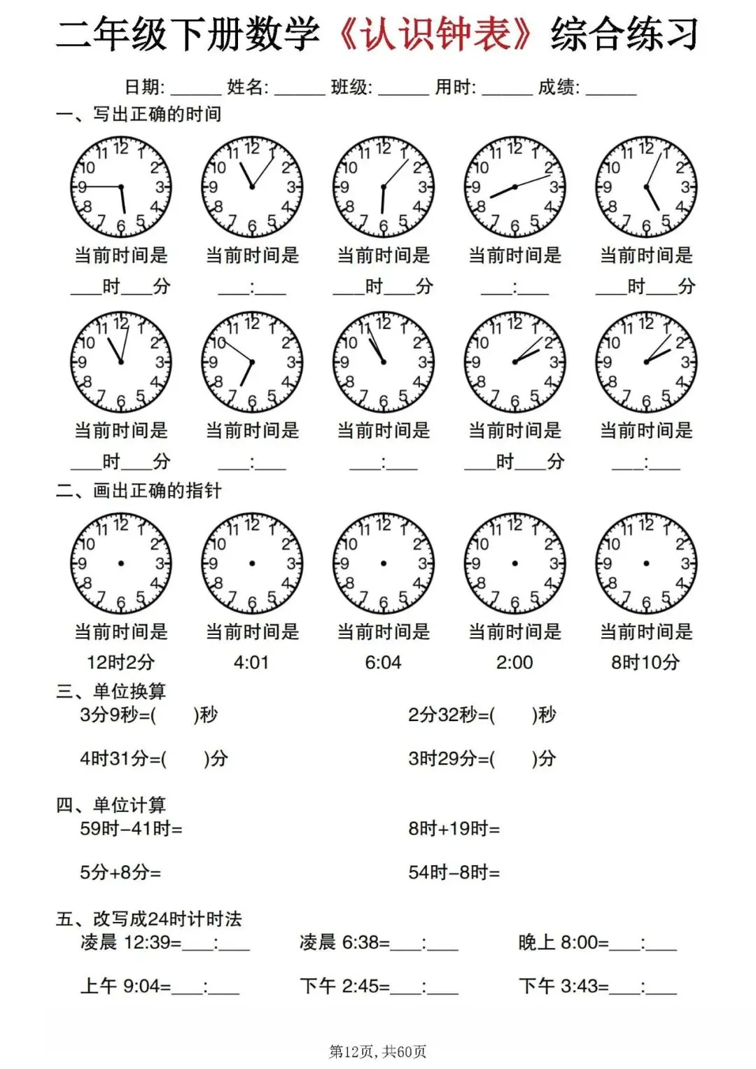 今天分享的是:二年级下册数学《认识钟表》综合练习。这套资料整理汇总了正确书写时间、单位换算、时间计算和12小时制与24小时制的改写等题型,可以帮助孩子系统的掌握钟表的所有知识点,是非常不错的专项练习材料!