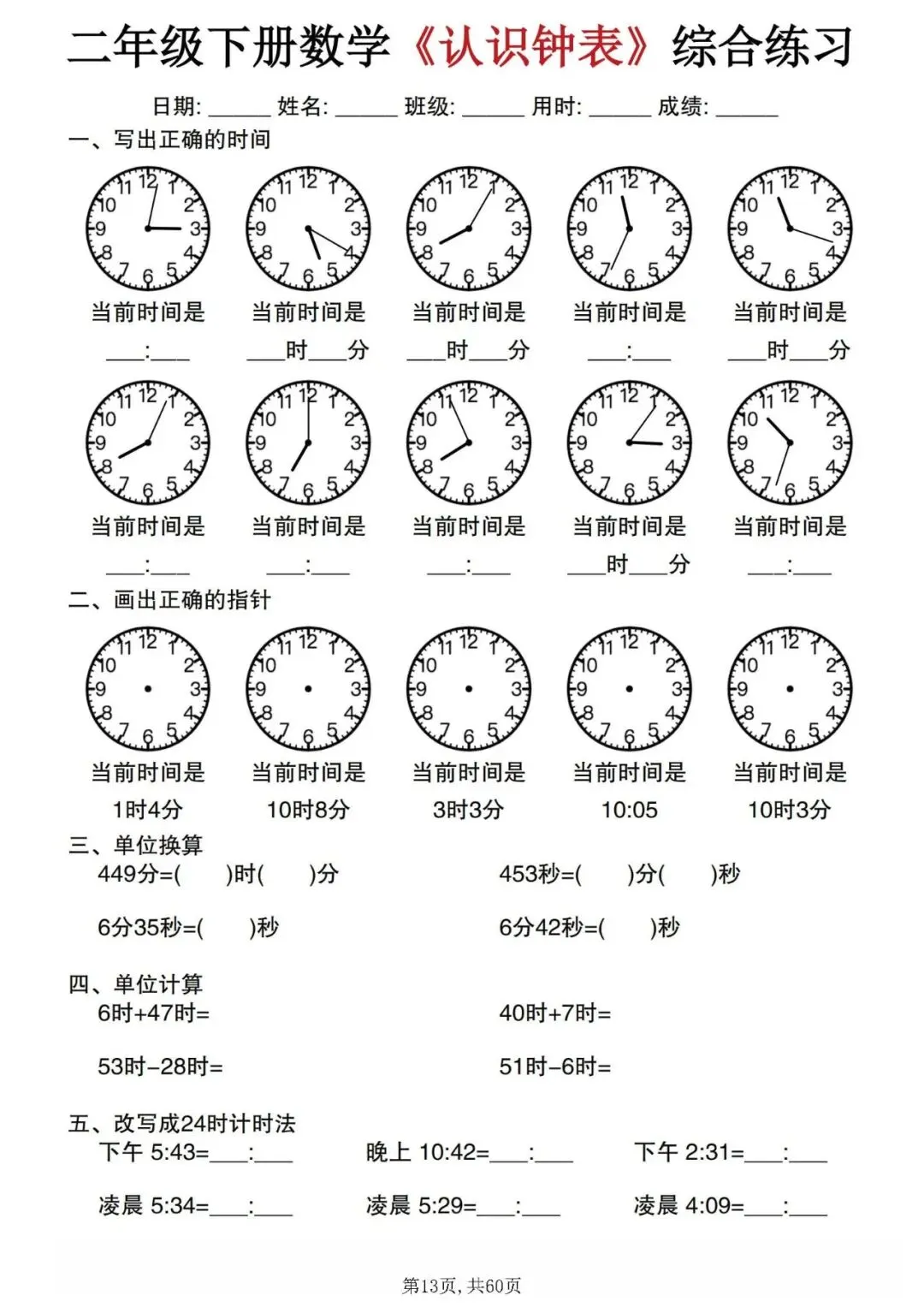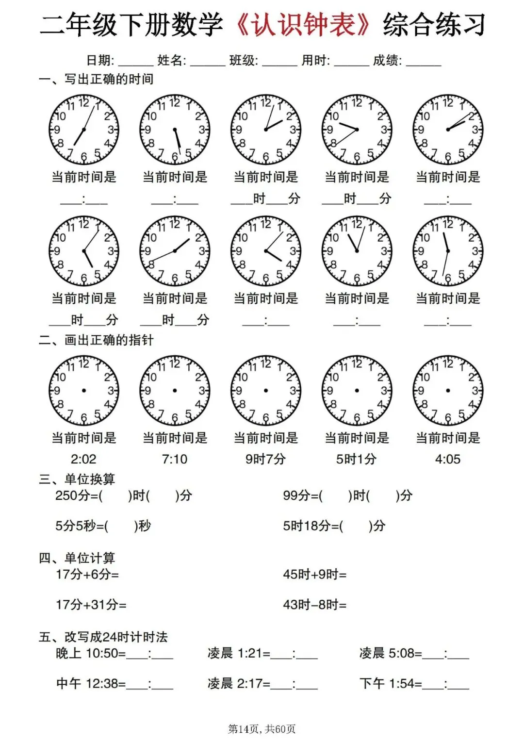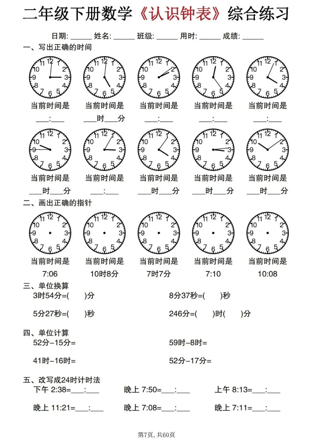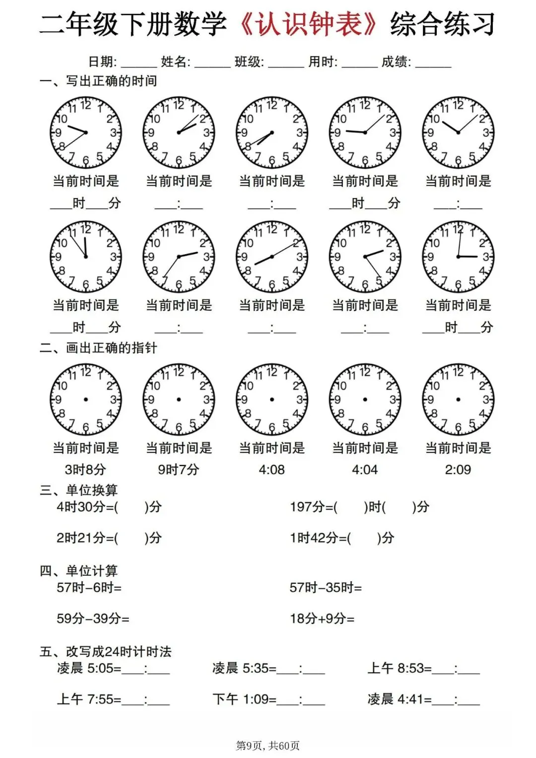 今天分享的是:二年级下册数学《认识钟表》综合练习。这套资料整理汇总了正确书写时间、单位换算、时间计算和12小时制与24小时制的改写等题型,可以帮助孩子系统的掌握钟表的所有知识点,是非常不错的专项练习材料!