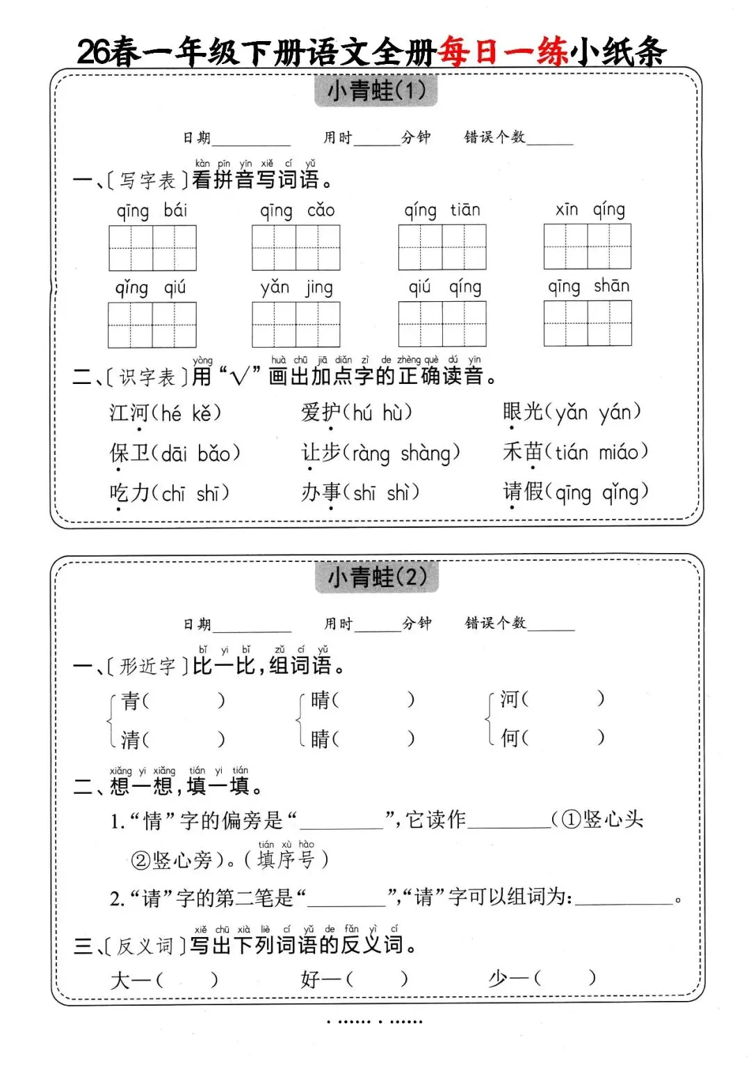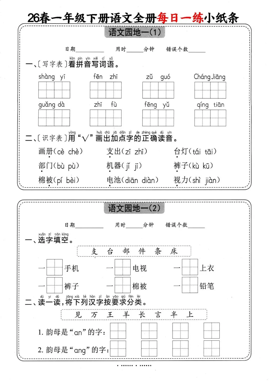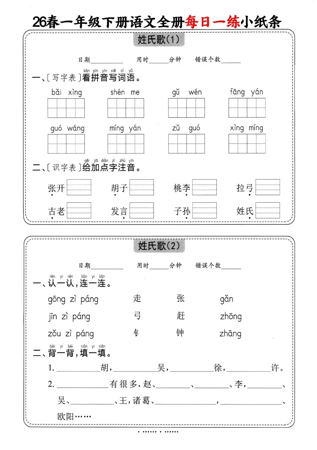 一年级(下)语文 全册每日一练小纸条,可下载打印 文末有高清电子版领取方式 由于篇幅有限,高清完整版请下载电子版哦 领取完整电子版方式: ①:发财的小手点一点右下角“👍”和“❤️” ②:关注公众号后,在对话框中回复:012 (点击名片可直接关注)↑↑↑