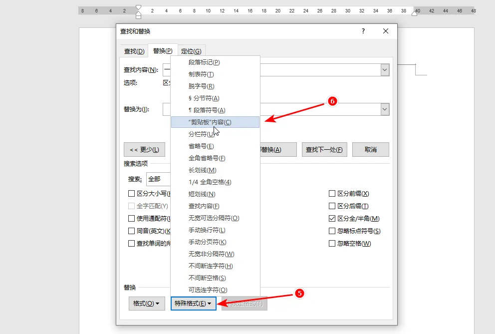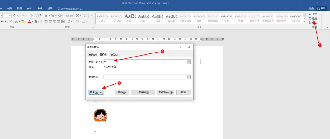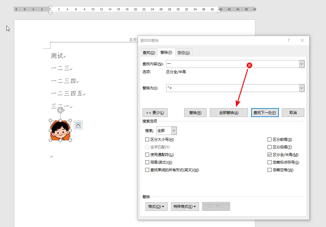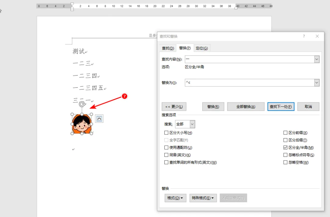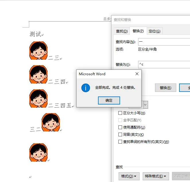 word中如何批量把文字替换为图片 应用场景:需要在word中把文字替换为图片的场景。 数据如下,要求把文字“一”都替换为下面的头像: 操作步骤 1. 点击“替换”按钮 2. 在“查找内容”的输入框中输入文字“一” 3. 点击“更多”按钮 4. 点击“替换为”的输入框 5. 点击“特殊格式”按钮 6. 点击“剪切板内容”选项 7. 选择图片,然后按下“Ctrl+C”复制图片 注意:复制了这个图片以后不要再复制其他内容,要不然替换的就是你最近一次复制的内容。 8. 点击“全部替换”按钮 9. 结果如下:
