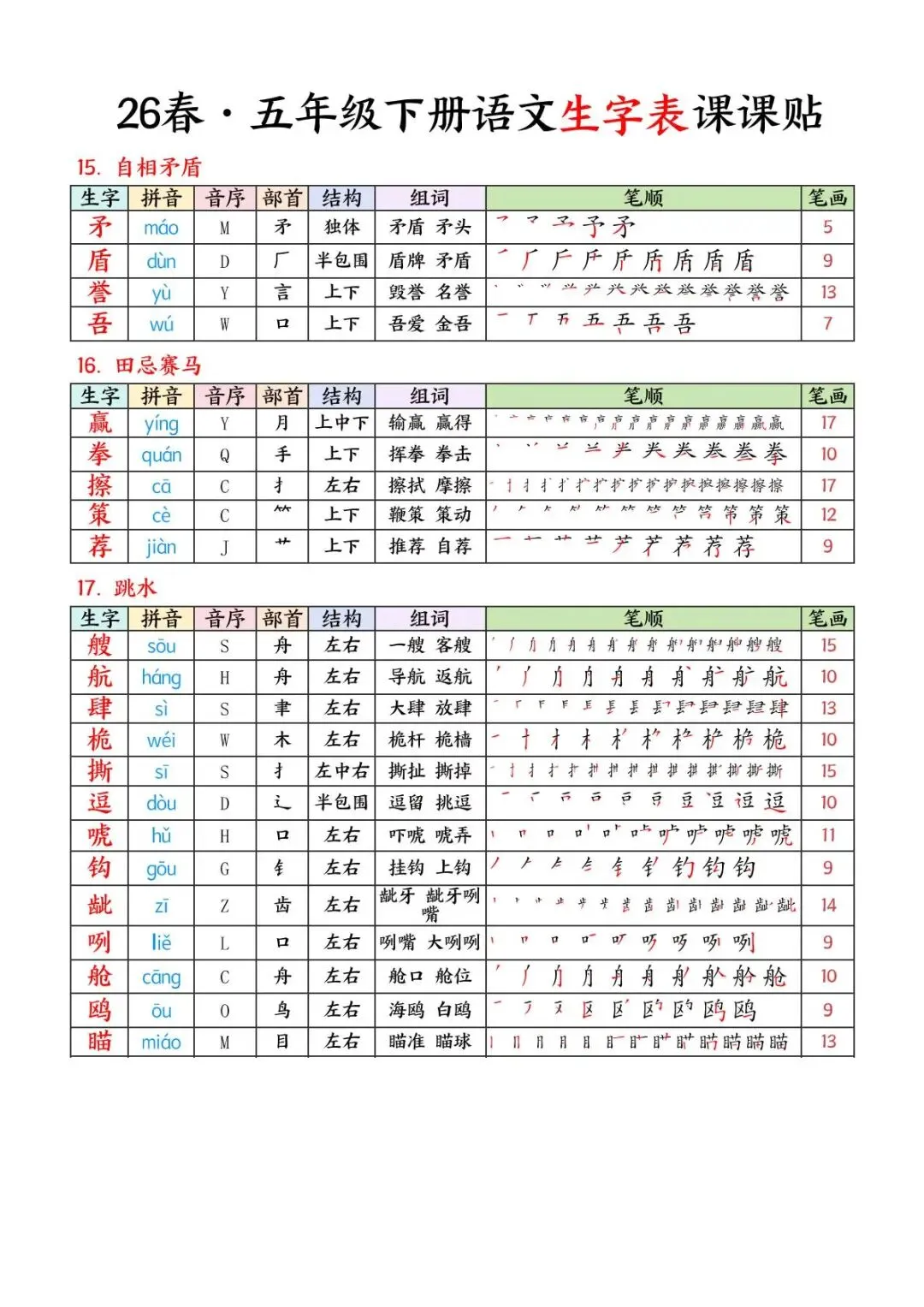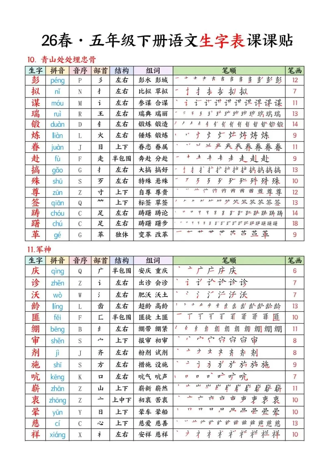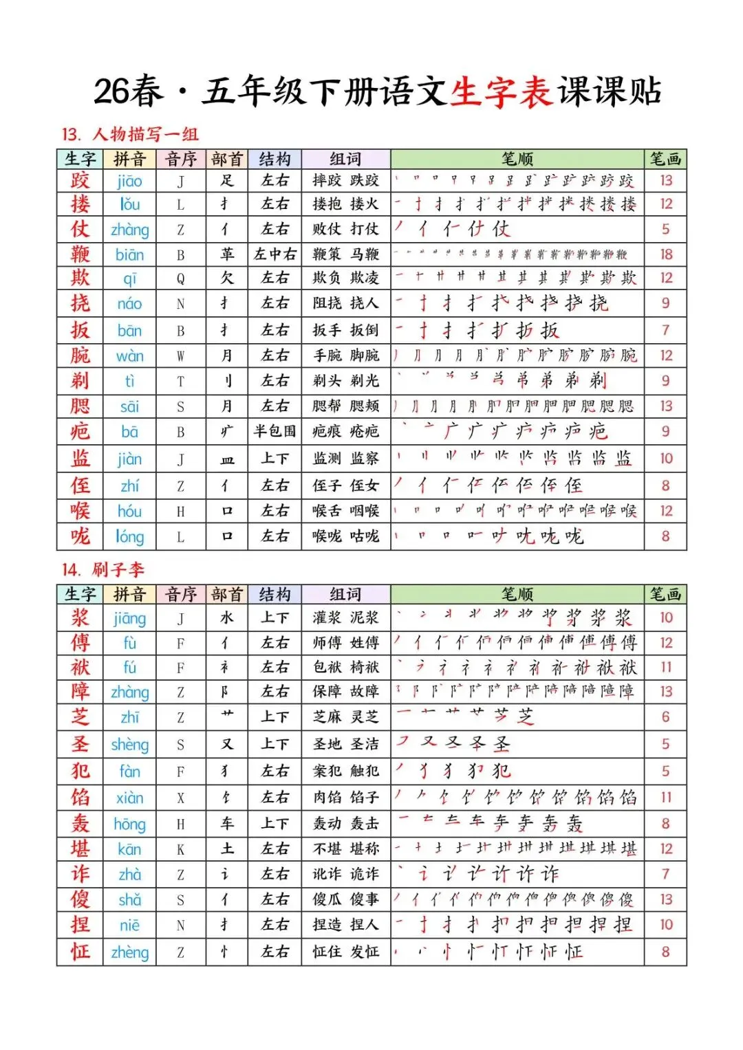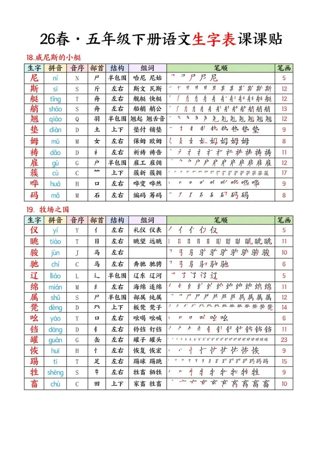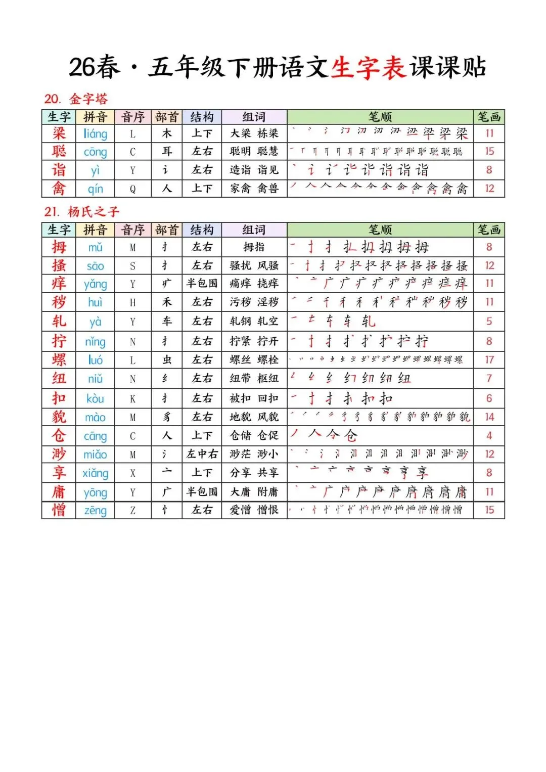 26 春・五年级下册语文生字表课课贴,电子版可下载可打印。这份资料同步全册课文,包含拼音、音序、部首、结构、组词、详细笔顺、笔画,重点突出,方便孩子日常预习、复习和规范练字,高效夯实字词基础。家长们可以打印出来,裁剪好,粘贴在课本上,以便孩子提前预习。