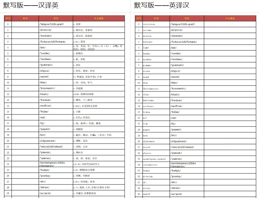 高中英语大纲词汇默写版(包含汉译英和英译汉)