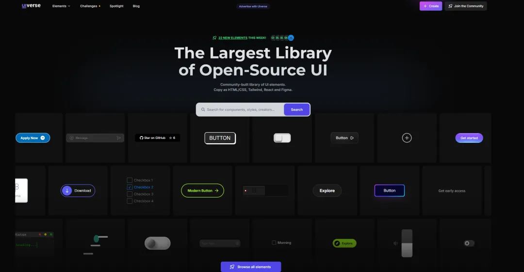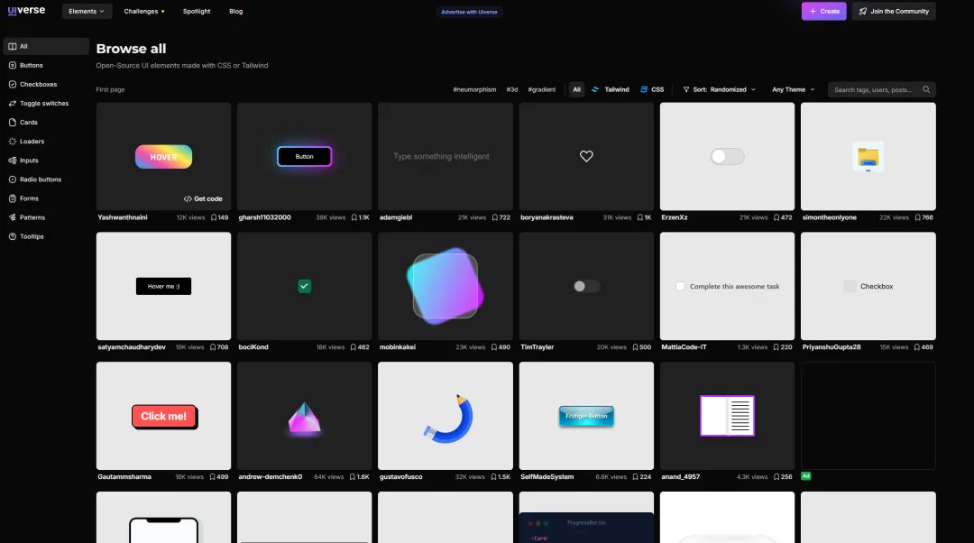 直接可以获取源码的css样式宝藏网站 1. CSS Inspiration(https://csscoco.com/inspiration/#/) 纯css,获取各类风格灵感的网站 2. uiverse (https://uiverse.io/) 各类风格样式组件 3.css可视化(https://css.bqrdh.com/animate) 很多工具,设计灵感