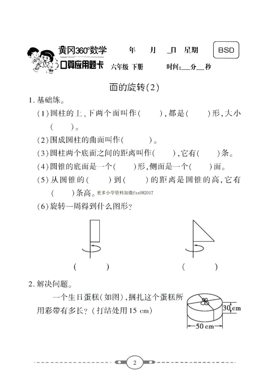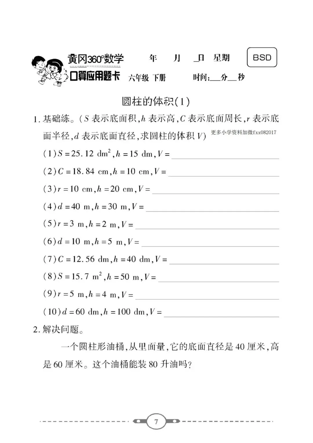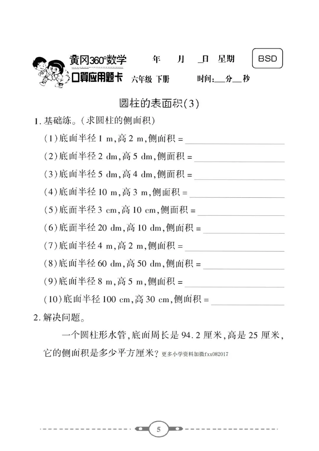 《口算题卡》六年级下册数学北师版 可免费下载打印