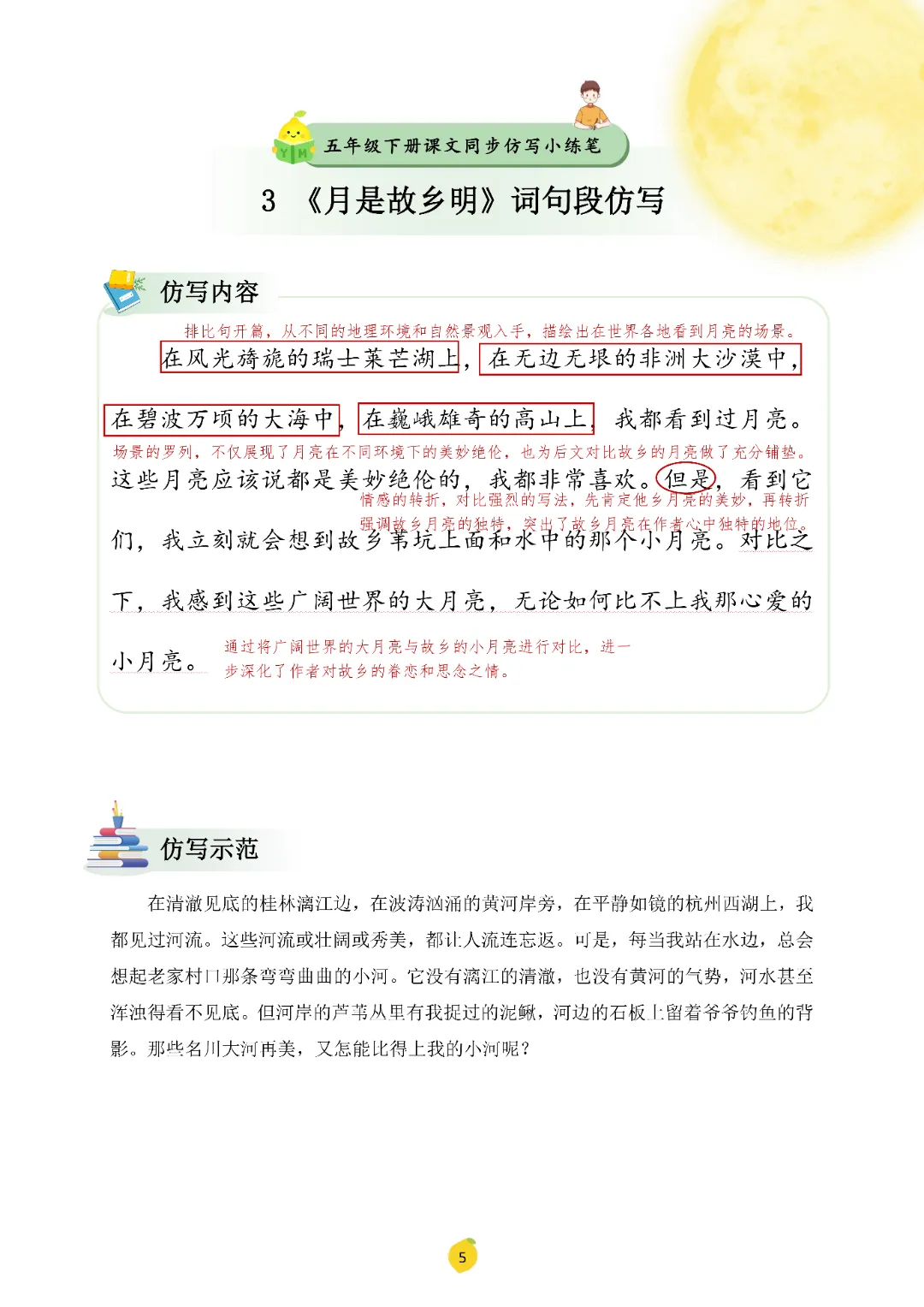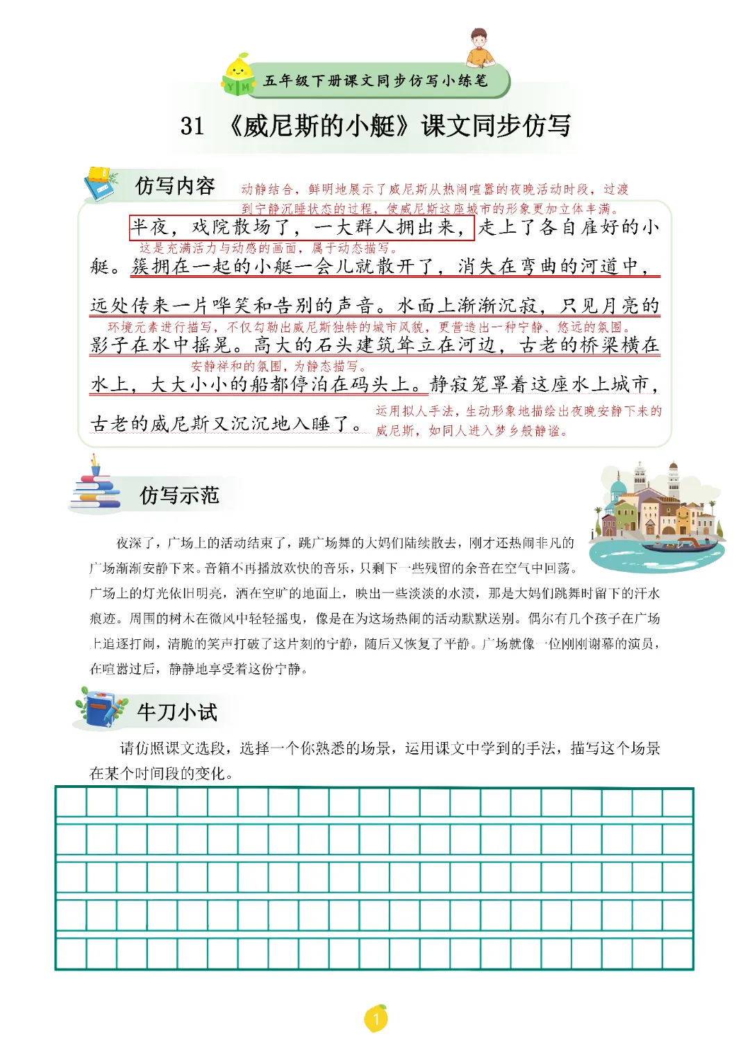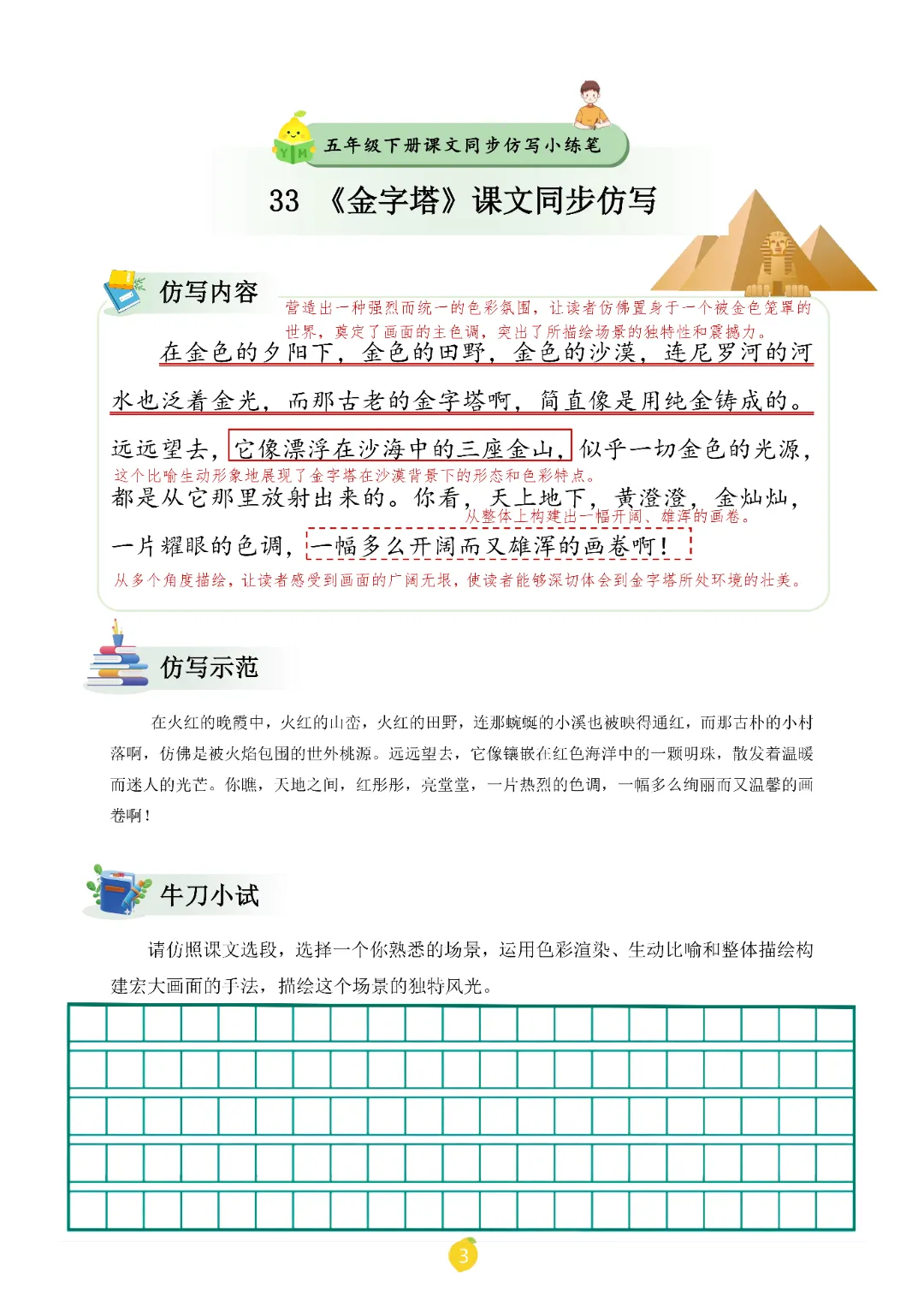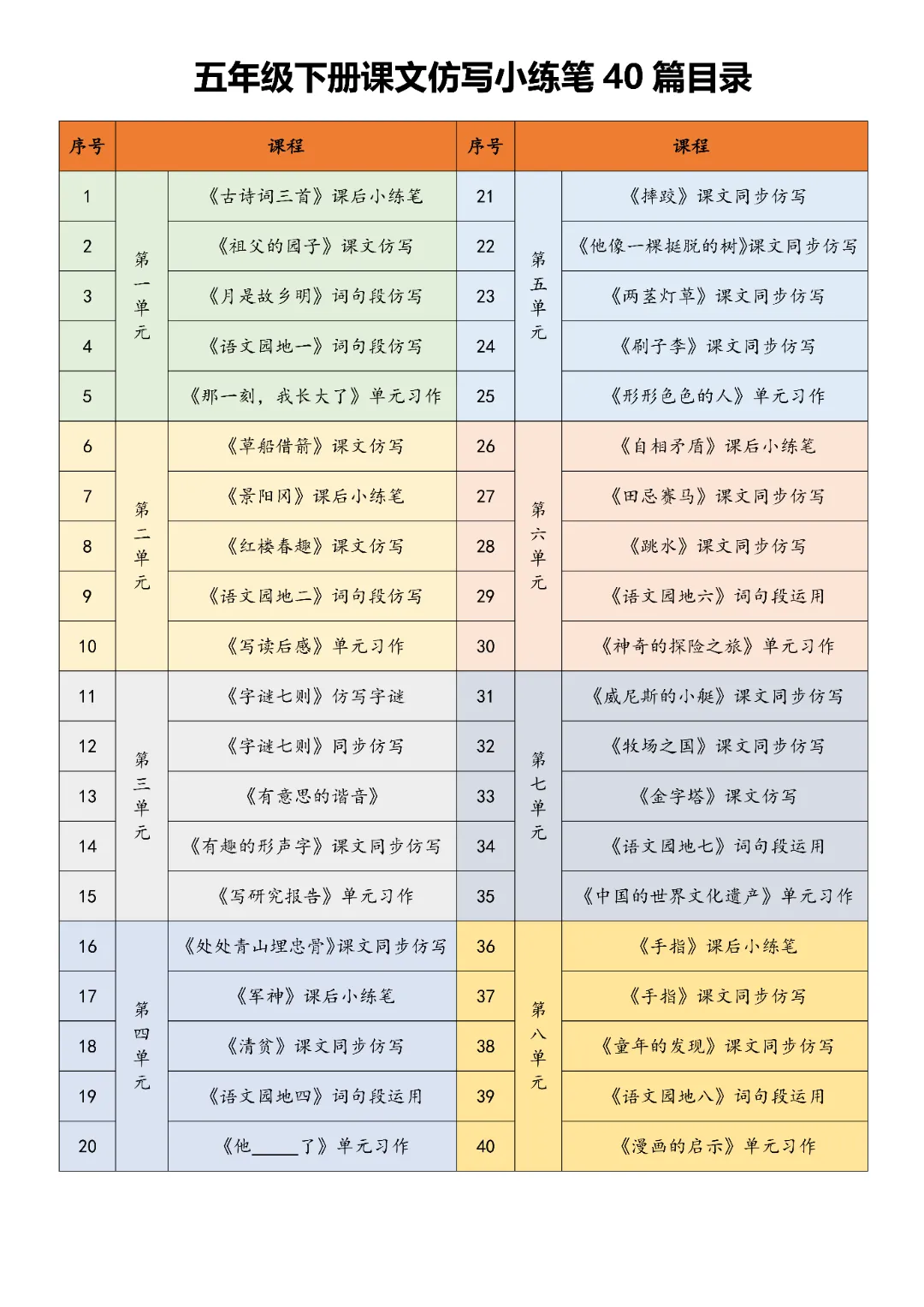 2026春人教统编版五年级下册语文《课文仿写小练笔》,含详细答案共68页,电子版可打印可下载。围绕五年级下册考试核心,展开练习,帮助孩子深入理解题型,夯实学科基础,培养孩子逻辑思维,提升知识综合运用能力与应试技巧,助力升学能力培养,从从容容游刃有余的度过春季学期。欢迎转发分享到班级群, 需要的家长们和老师们抓紧领取一份吧。