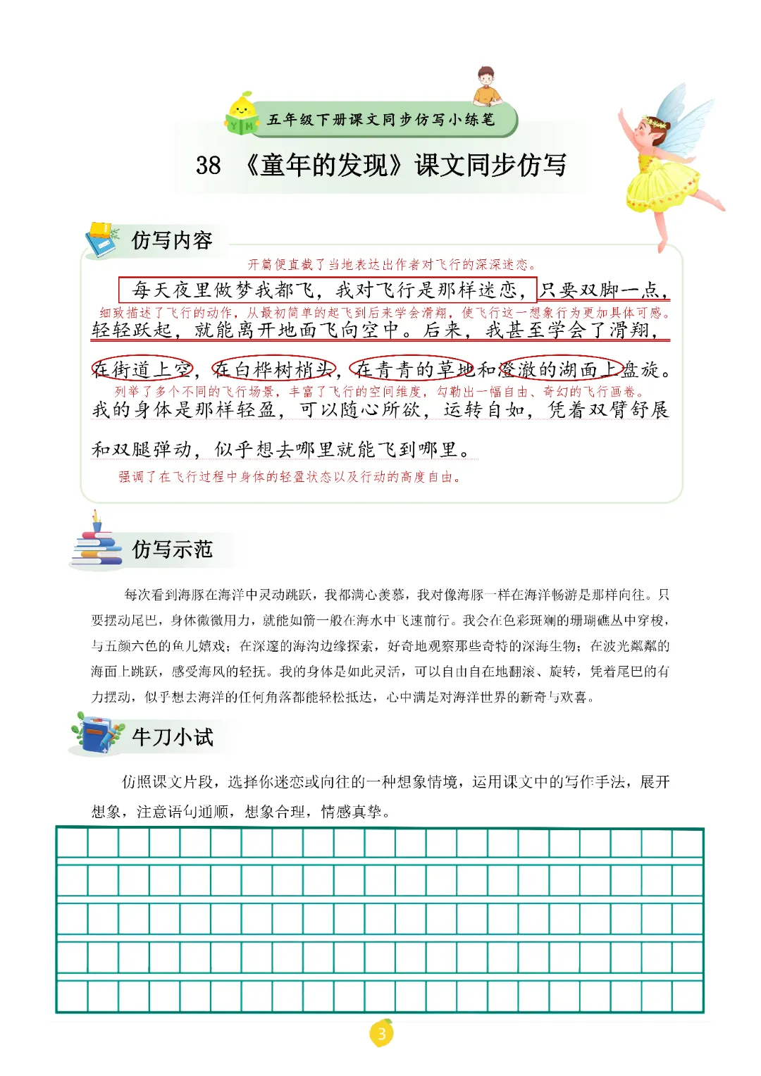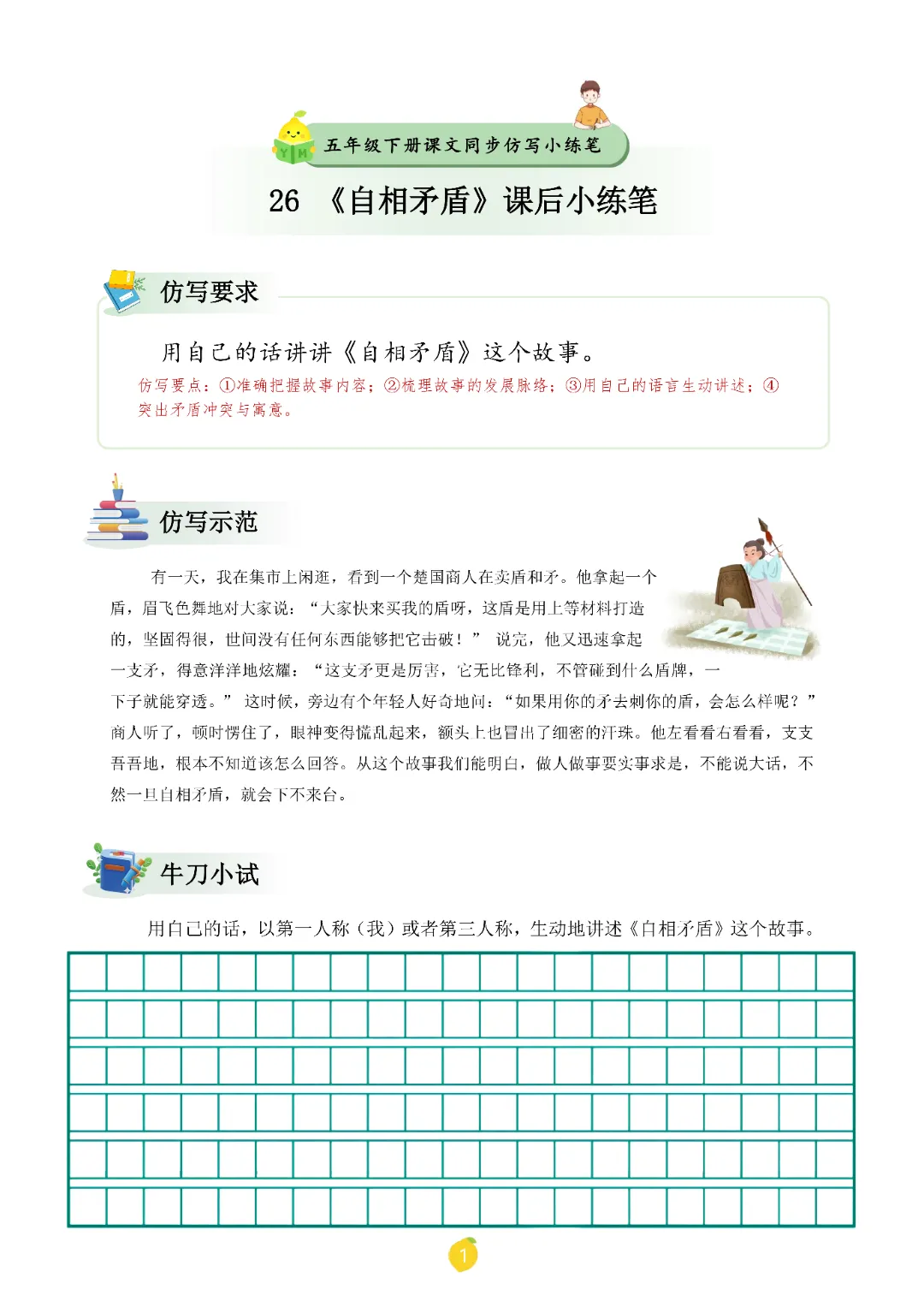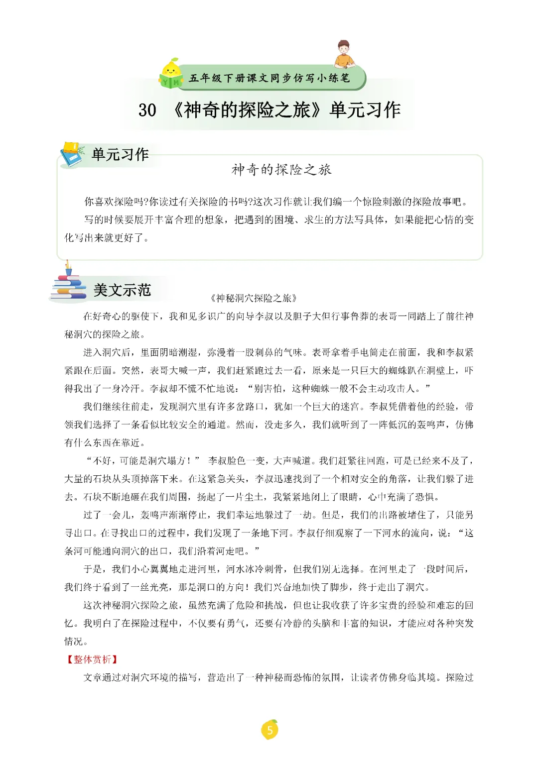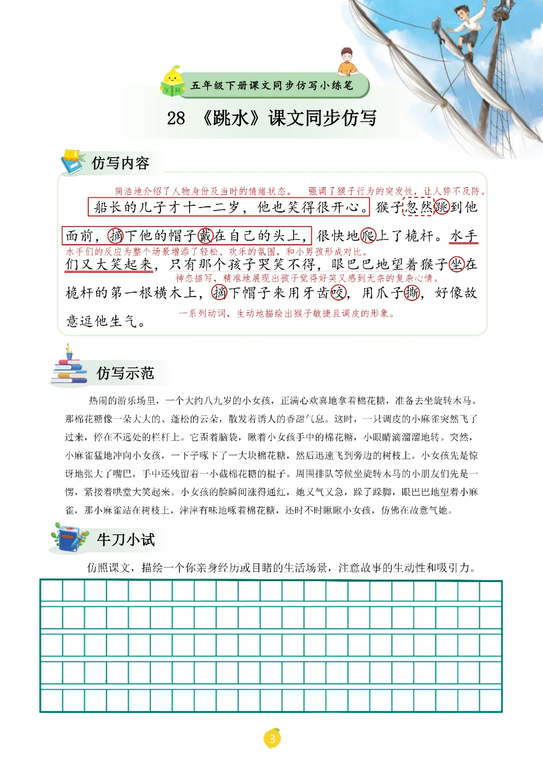 2026春人教统编版五年级下册语文《课文仿写小练笔》,含详细答案共68页,电子版可打印可下载。围绕五年级下册考试核心,展开练习,帮助孩子深入理解题型,夯实学科基础,培养孩子逻辑思维,提升知识综合运用能力与应试技巧,助力升学能力培养,从从容容游刃有余的度过春季学期。欢迎转发分享到班级群, 需要的家长们和老师们抓紧领取一份吧。