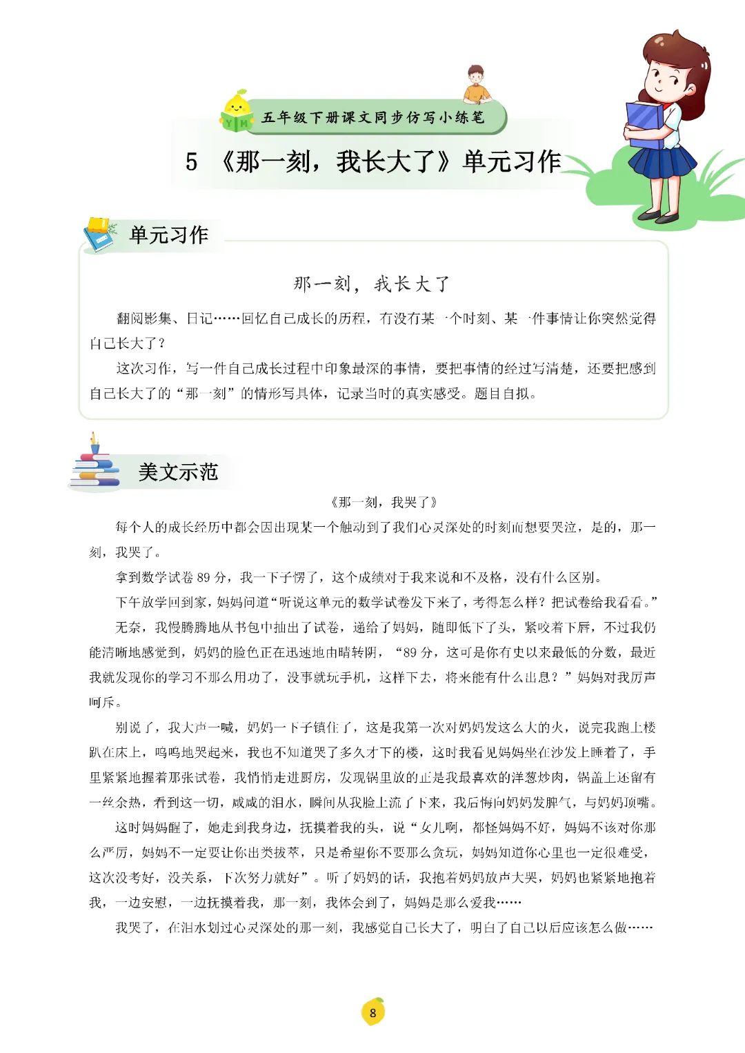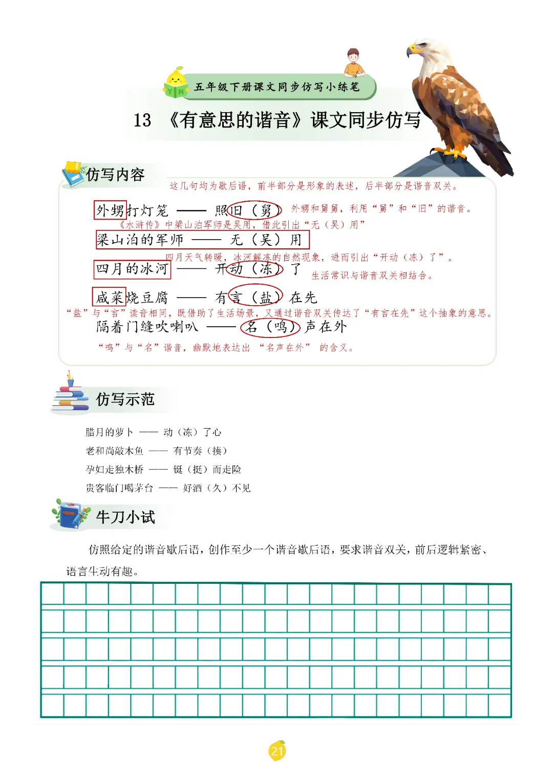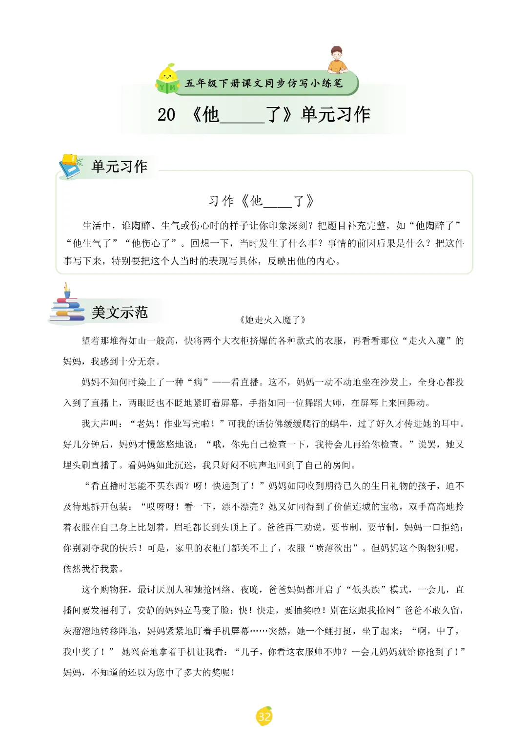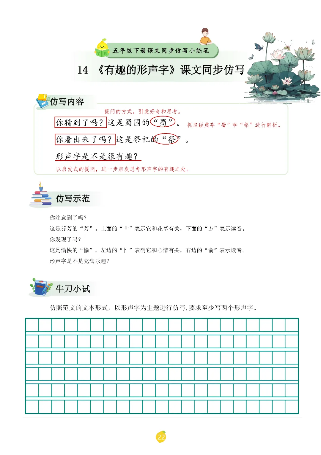 2026春人教统编版五年级下册语文《课文仿写小练笔》,含详细答案共68页,电子版可打印可下载。围绕五年级下册考试核心,展开练习,帮助孩子深入理解题型,夯实学科基础,培养孩子逻辑思维,提升知识综合运用能力与应试技巧,助力升学能力培养,从从容容游刃有余的度过春季学期。欢迎转发分享到班级群, 需要的家长们和老师们抓紧领取一份吧。