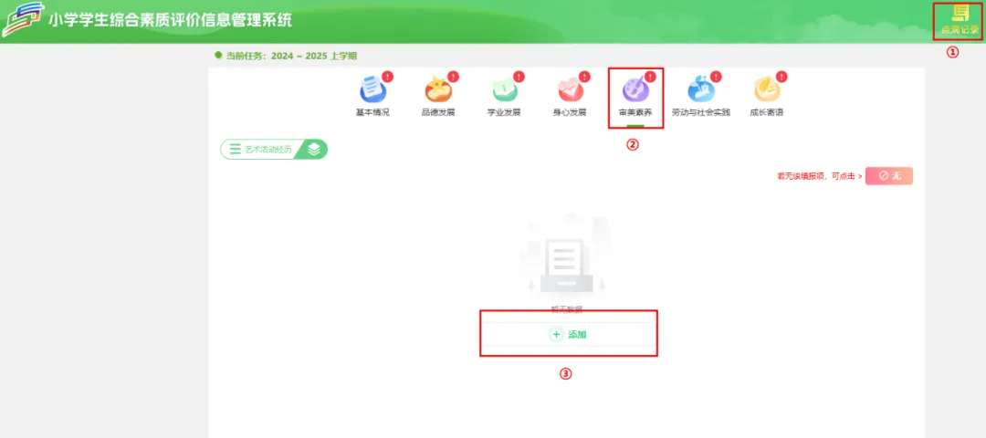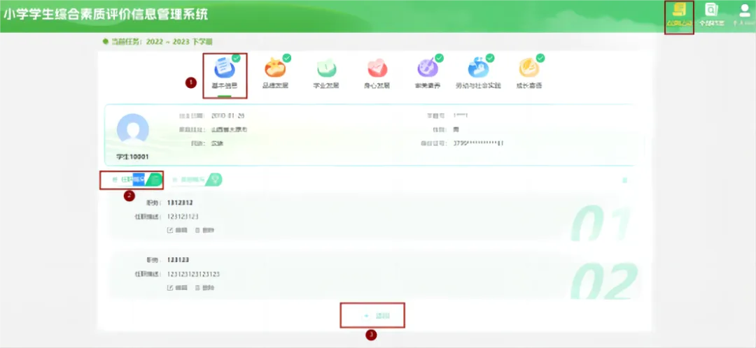 学生进入系统后点击【点滴记录】–>【学业发展】->【综合性学习情况】可添加学生的日常各门课程知识与技能的掌握情况、课堂表现、自主学习意识和能力、阅读习惯,参加学校拓展课程、社团活动,小制作、小发明科学兴趣特长等情况。