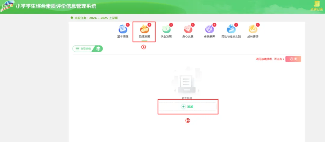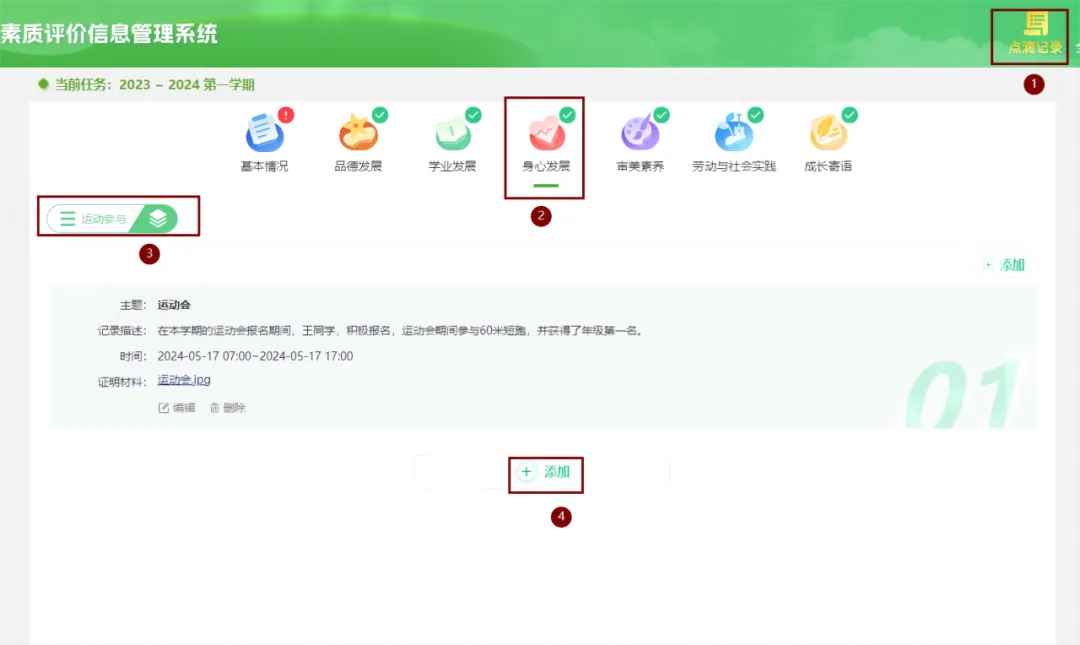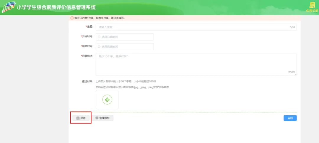 学生用户点击【点滴记录】–>【品德发展】–>【添加】按钮,根据标题、开始时间填写内容,填入后点击【保存】按钮。