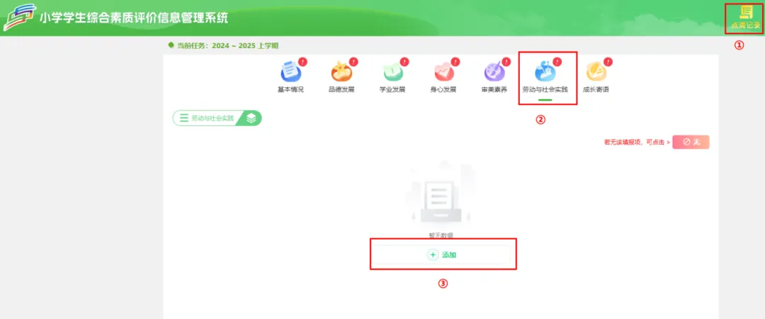 学生用户点击【点滴记录】–>【劳动与社会实践】–>【添加】按钮,根据活动类行、活动主题等字段填写内容,填入后点击【保存】按钮即可。