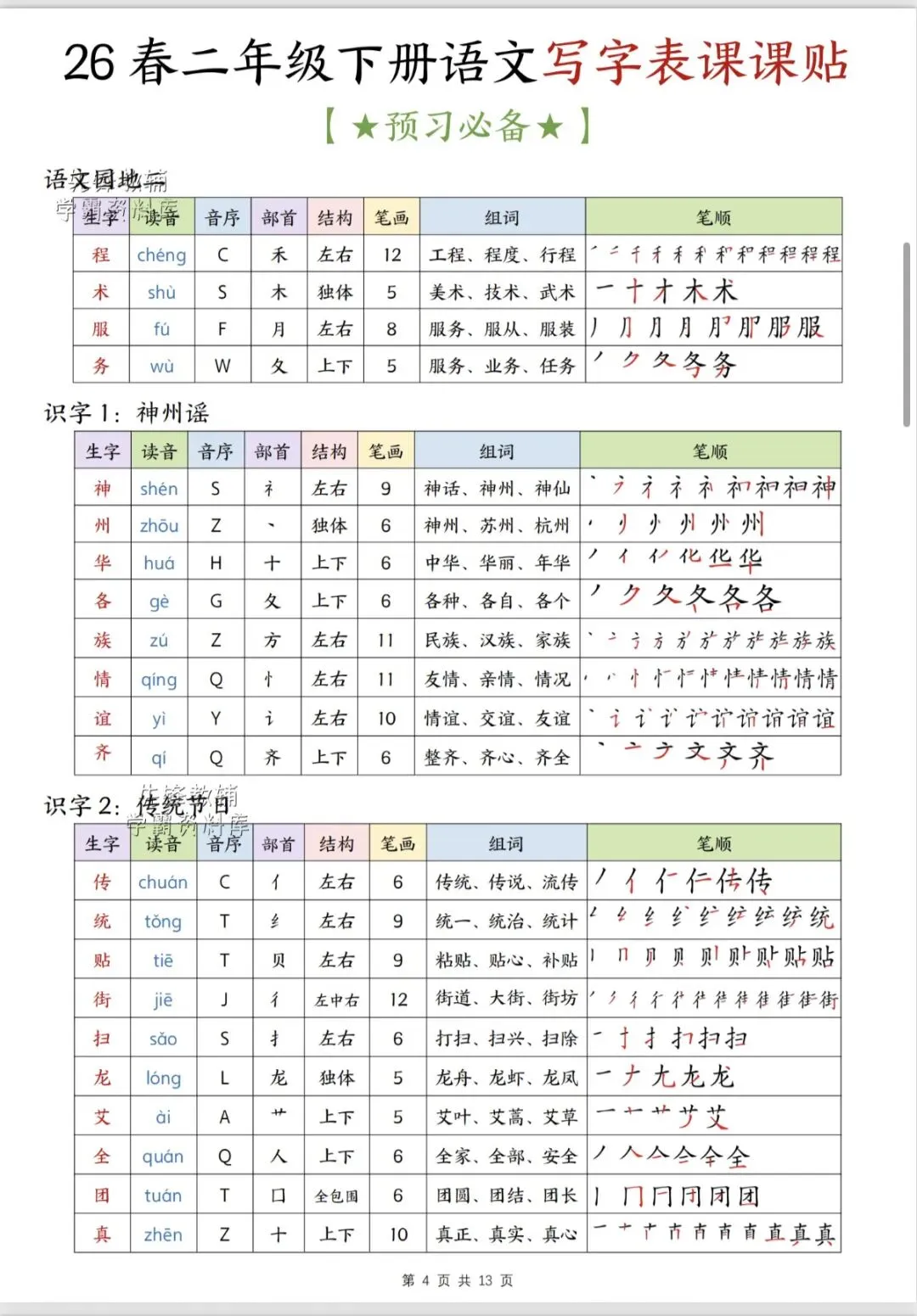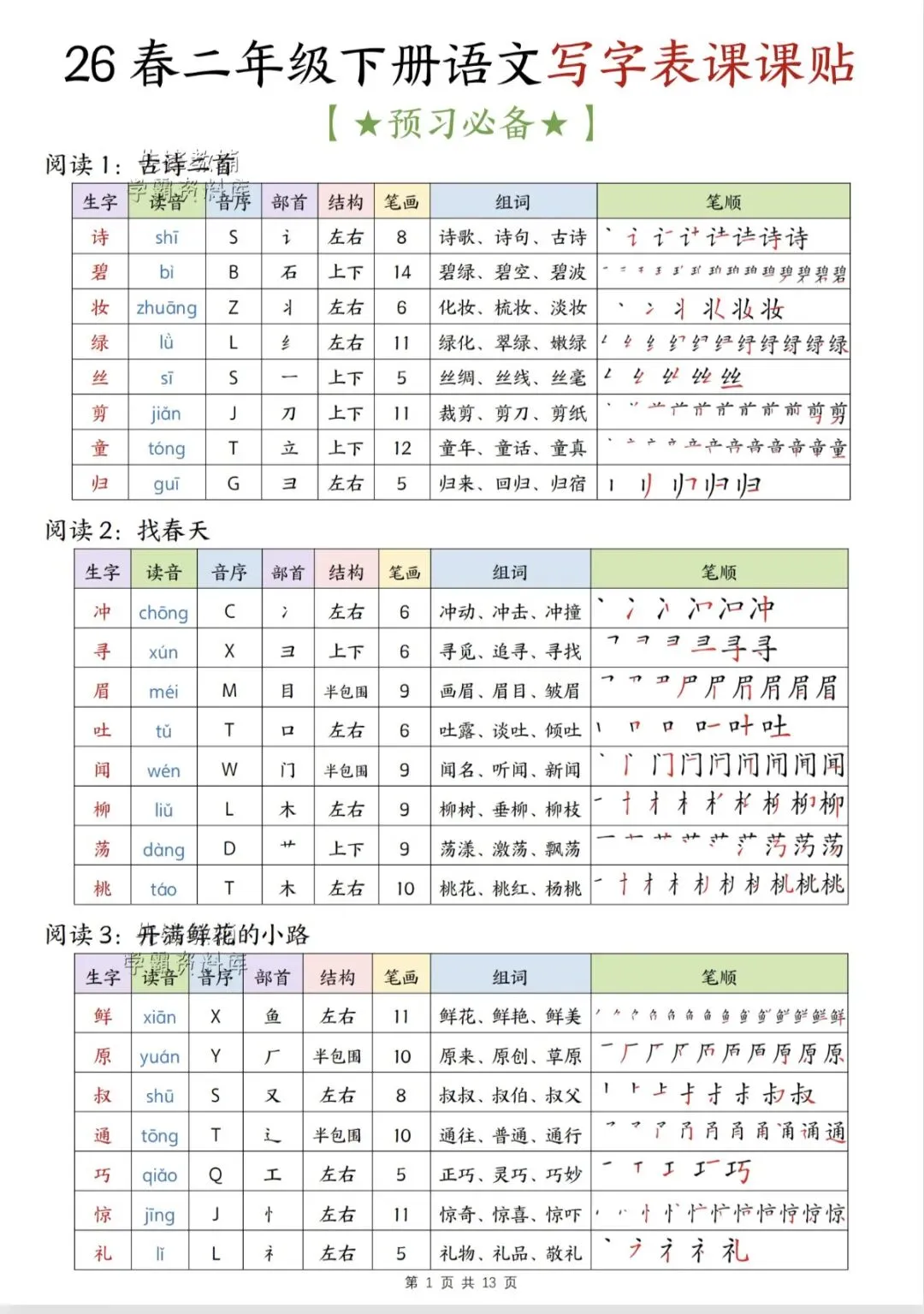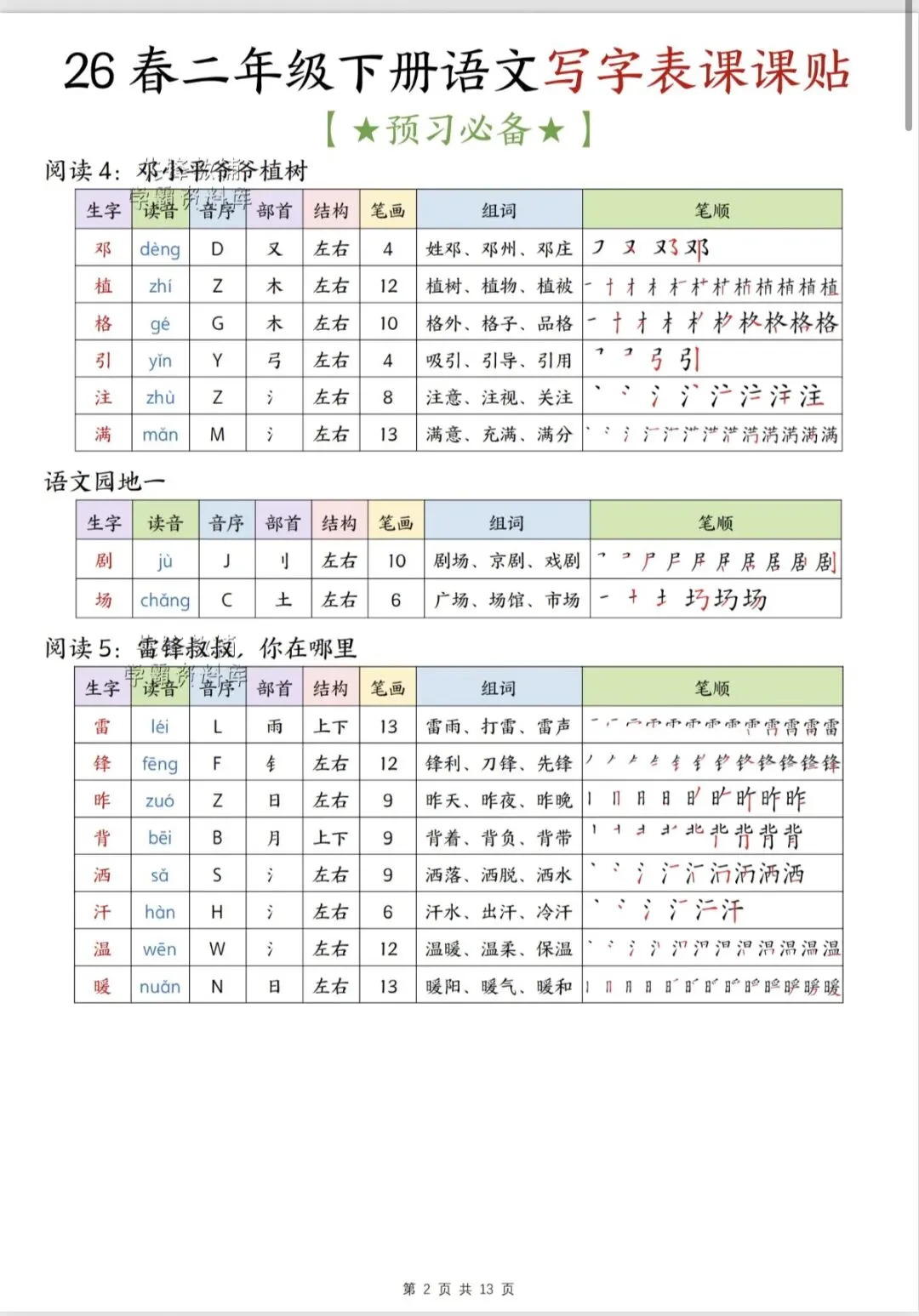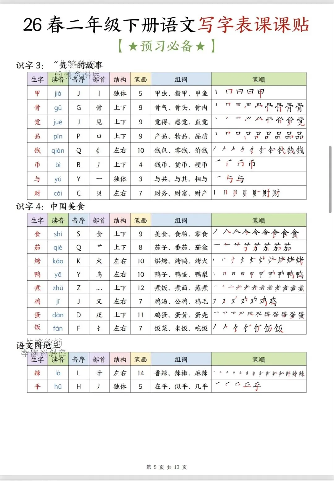 二年级语文下册写字表课课贴(完整版可打印)