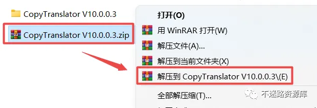1.选中下载的压缩包,然后鼠标右键选择解压到“CopyTranslator V10.0.0.3”(没有解压选项点这里)