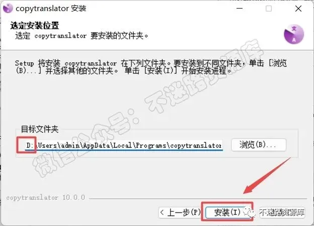 5.点击“浏览”可以选择软件安装路径,建议和教程中的保持一致,本例安装到D盘(将路径地址中的首字符C改为D表示安装到D盘,或者可以在其它磁盘里创建一个新的文件夹,安装路径不要出现中文),点击“安装”