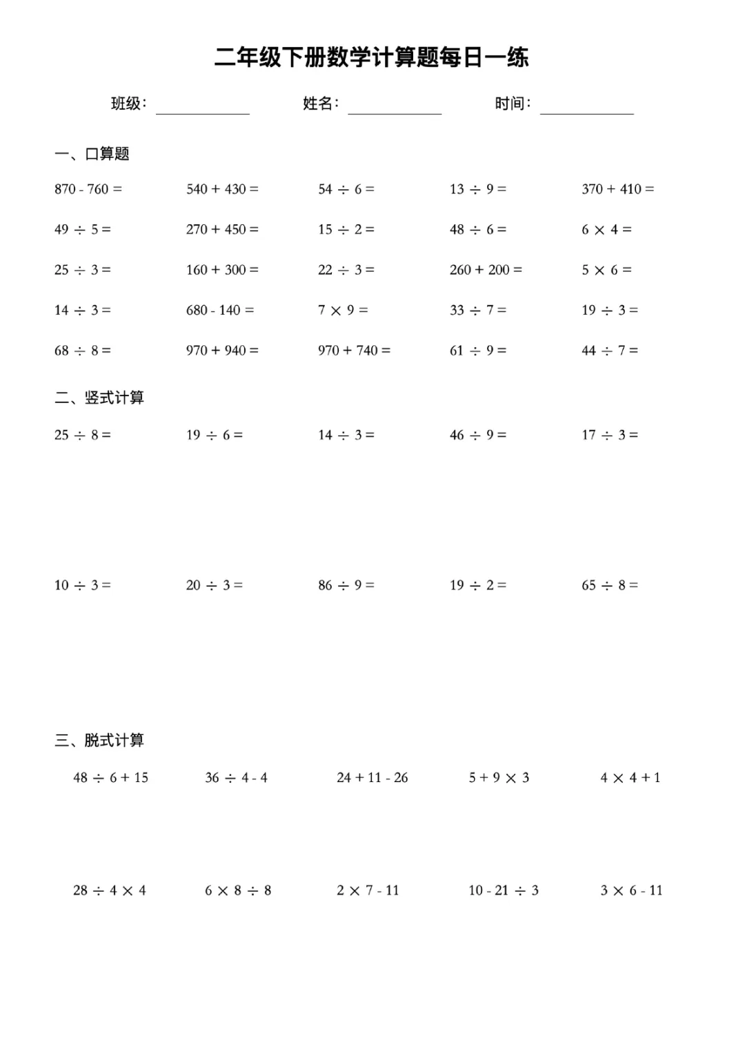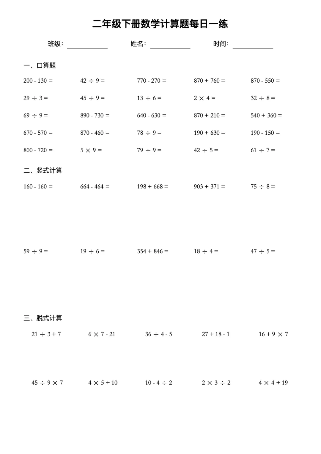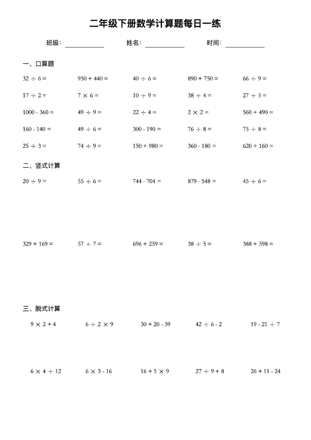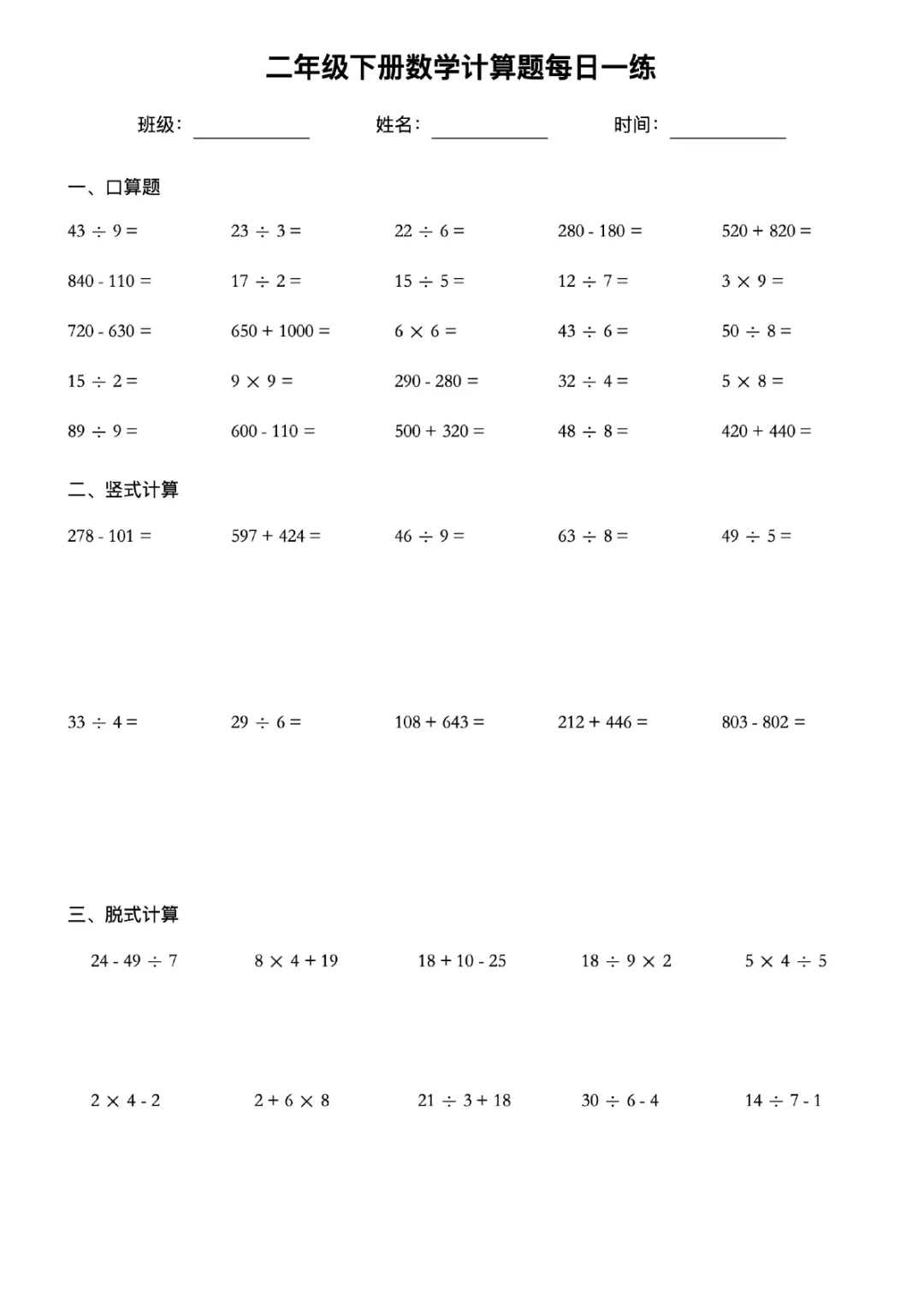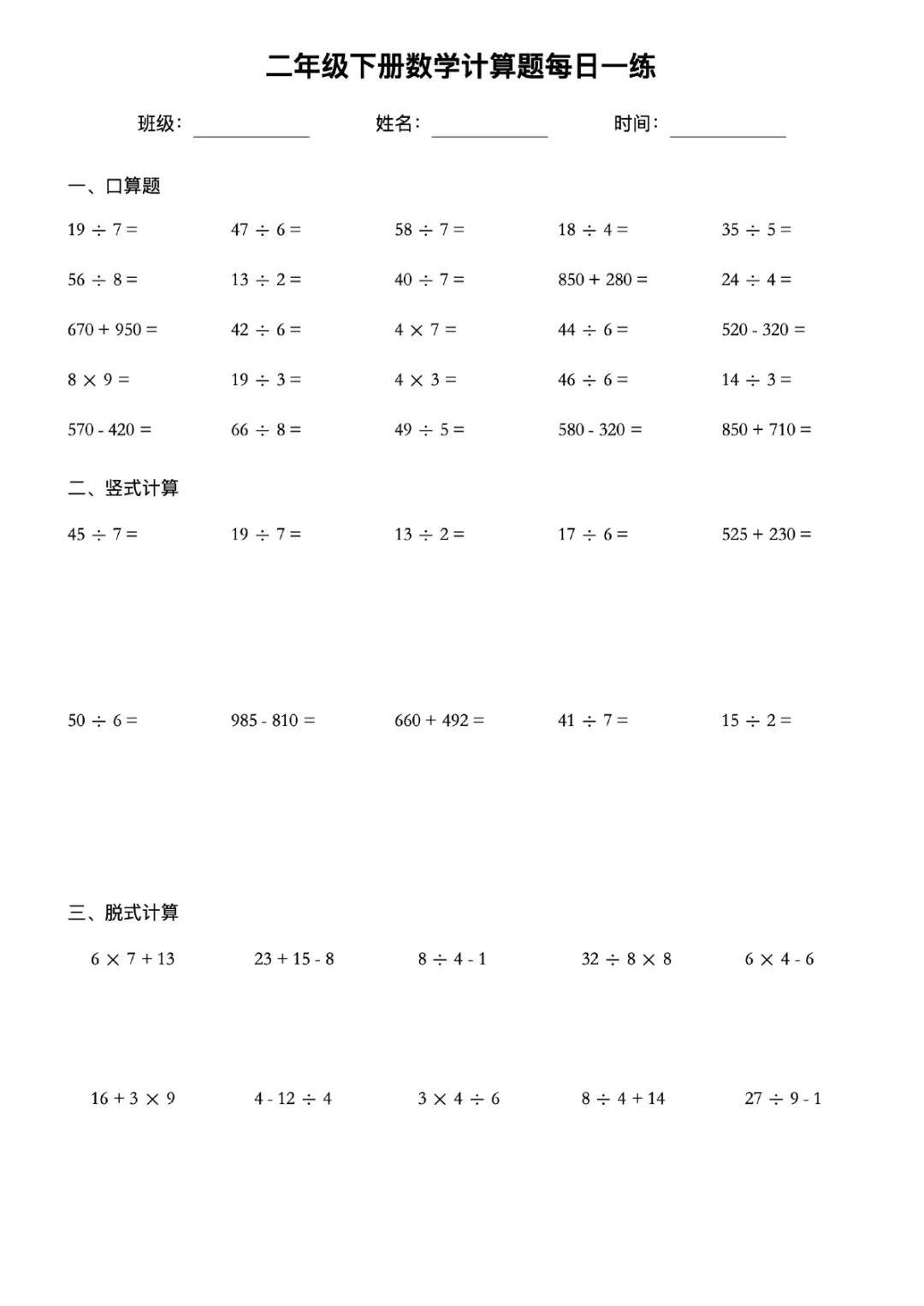 本站文章均为手工撰写未经允许谢绝转载:夜雨聆风 » 二年级下册数学计算题每日一练电子版可打印带答案