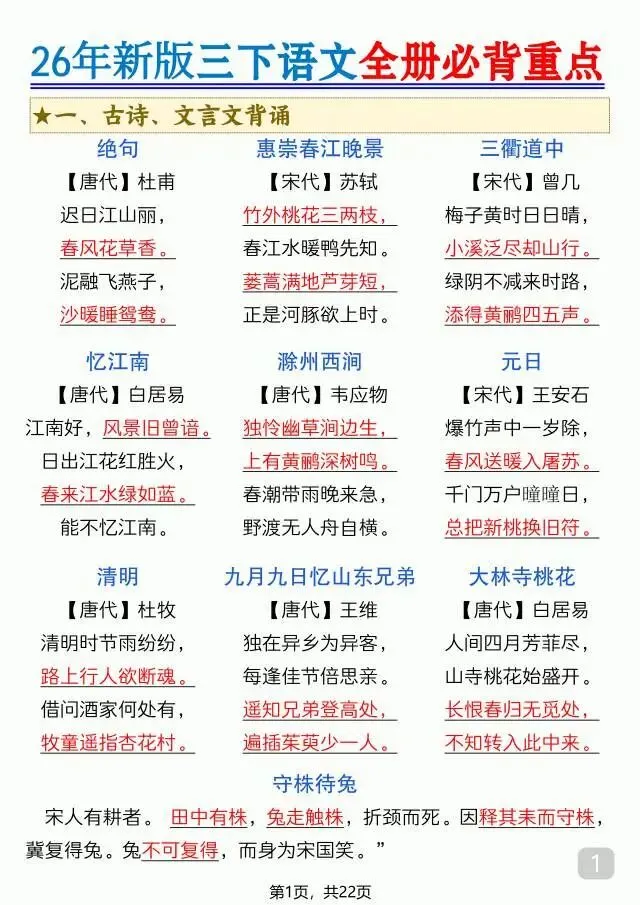 这份26年新版三年级(下)语文全册必背重点,梳理了全册十二大核心知识点,涵盖古诗文言文、课文背诵、日积月累、字词积累、课文重点、口语交际等全板块内容,考点清晰、重点突出,排版条理分明,从必背内容到词句运用、课内知识点解读一应俱全,是三下语文学习、复习的实用干货,能帮孩子精准抓牢课内重点,夯实语文基础。