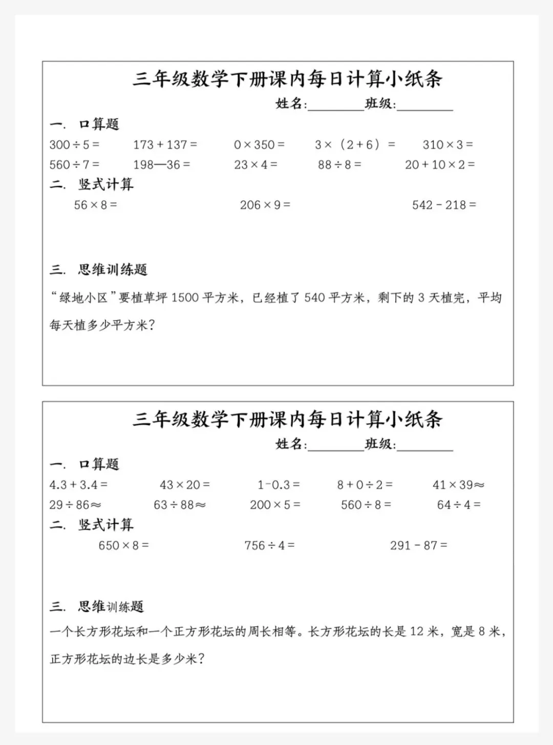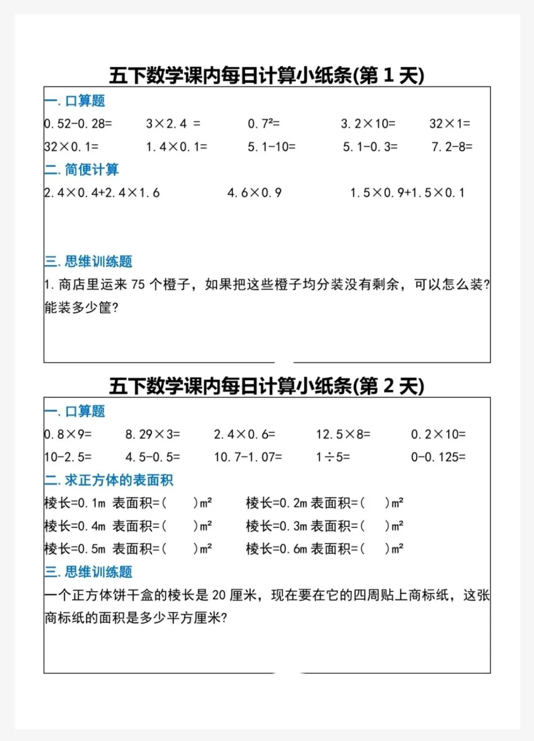 ❤️五下数学(课内每日计算小纸条10天)链接: